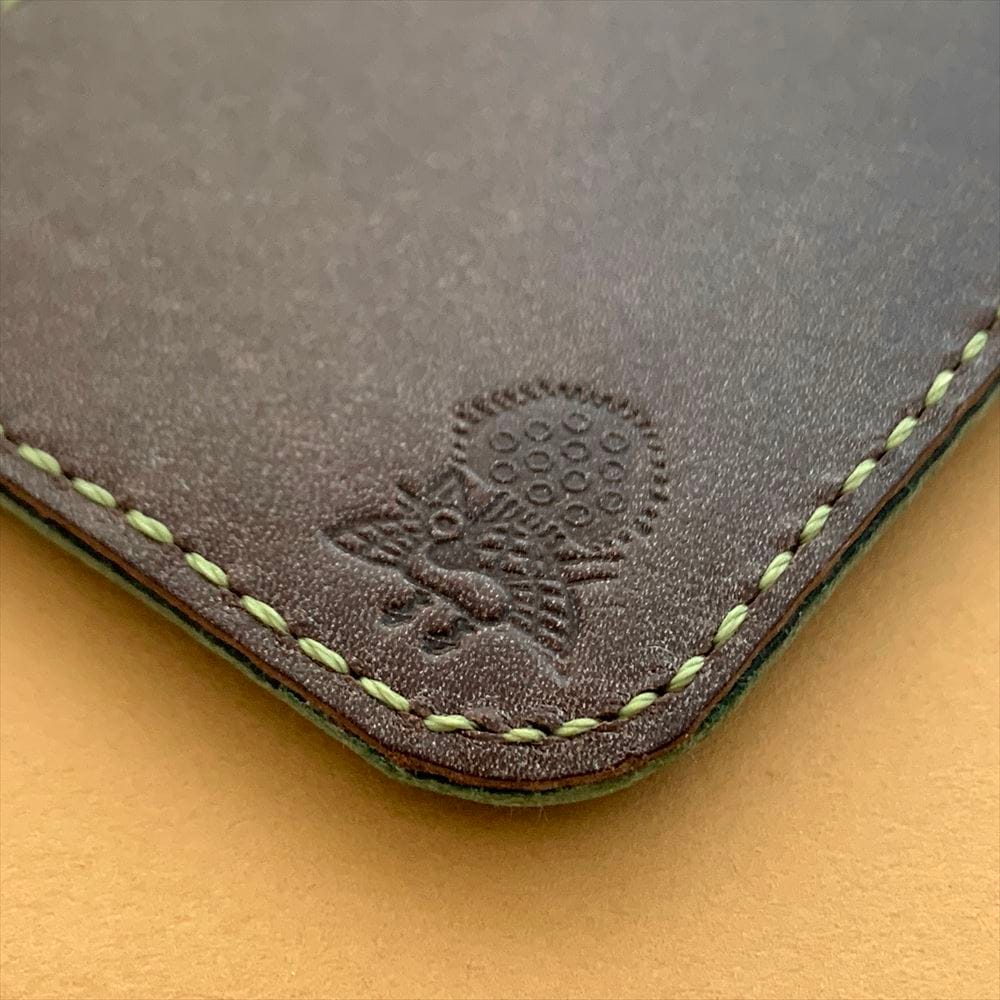 本革を手縫いで仕上げたイーソー柄のパスケースです。イーソーは革に刻印されており、実際の麻雀牌同様の手触りも楽しめます。裏面には小さなイーソーのワンポイント刻印も入ってます。