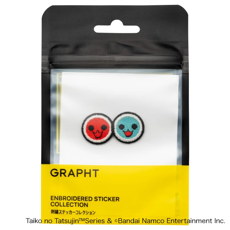 「太鼓の達人」タイトルロゴを始め、大人気キャラクターのどんちゃん(和田どん)とかっちゃん(和田かつ)を刺繍ステッカーで再現。