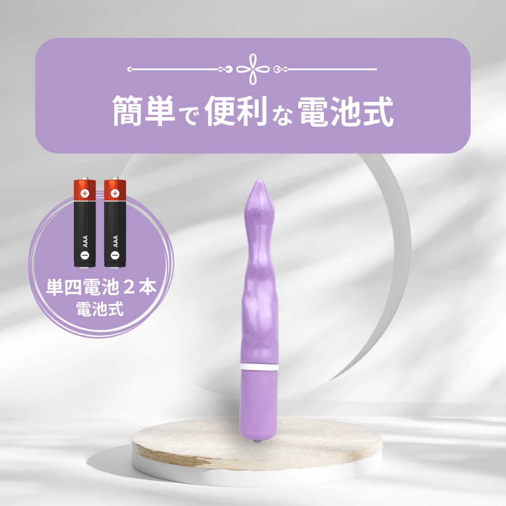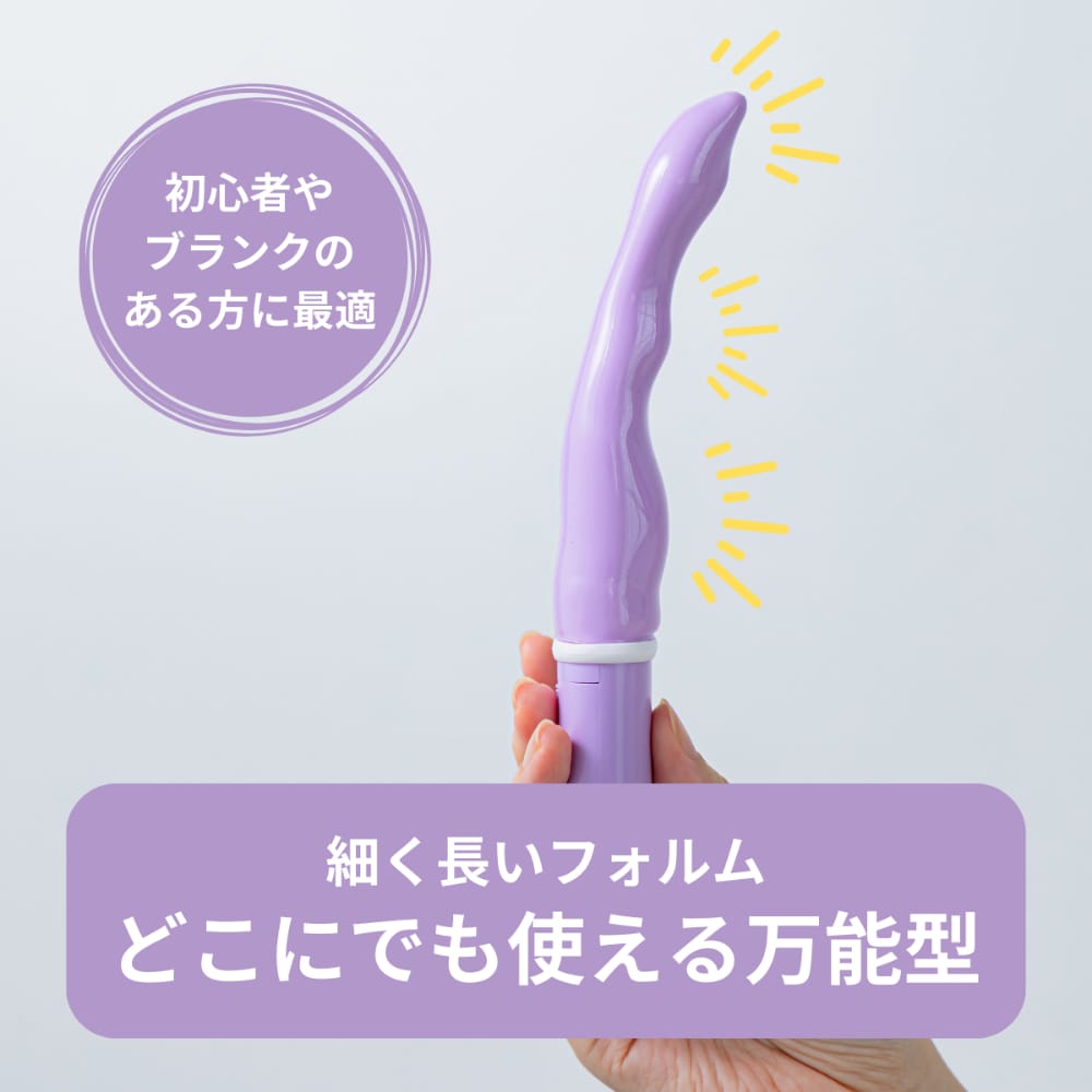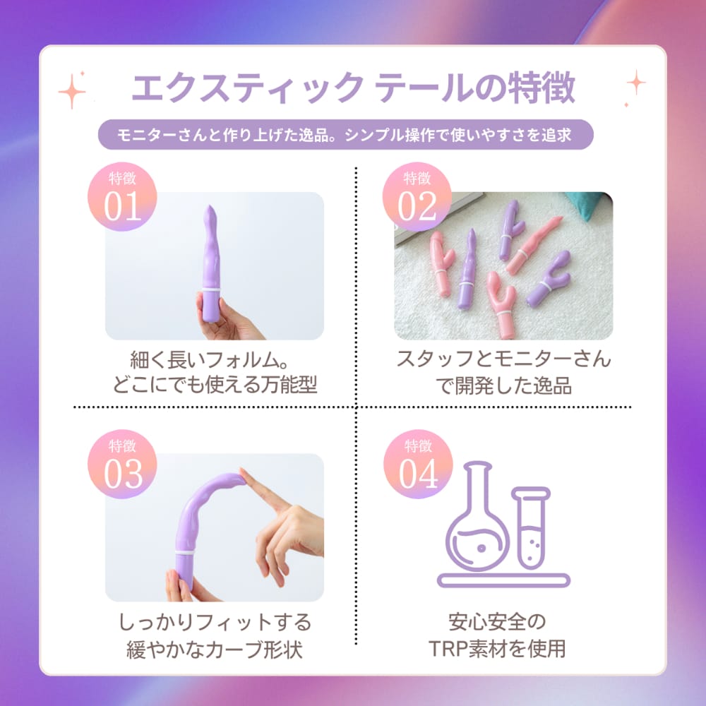 ちょうどイイがきもちイイ!柔らか新感覚バイブ!エクスティックテールは、テール(尻尾)という名前の通り、細く長いフォルムが特徴。内部の複雑な形にもしっかりフィットするウェーブ形状で、指でするように細部を隈なく刺激することができます。細身のコンパクトヘッドは先端をひときわ細くデザインすることで、ビギナーの方やブランクのある方、バックドアプレイにもぴったりなカタチにしました。ただ細いだけでなく、なだらかな3段階の膨らみが感じるスポットを押し上げるように刺激するので、ゆっくり動かすだけでも確かな感覚を体感いただけます。