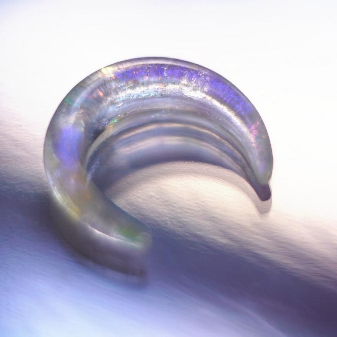 冬の夜空に美しく青白い輝きを放つ上弦の月。世界にひとつのガラスのペンダントにお作りしました。円形に近い三日月のフォルムです。無色透明をベースに美しい煌きを。暗闇では神秘的な光を放ちます。さまざまな表情をお楽しみいただけます。