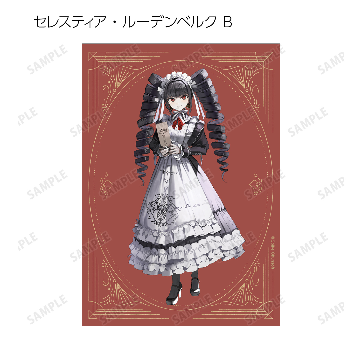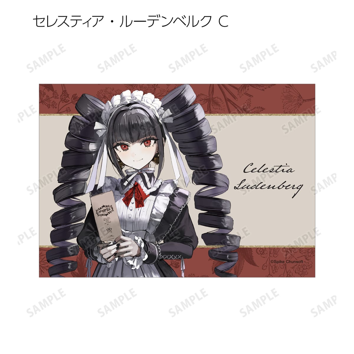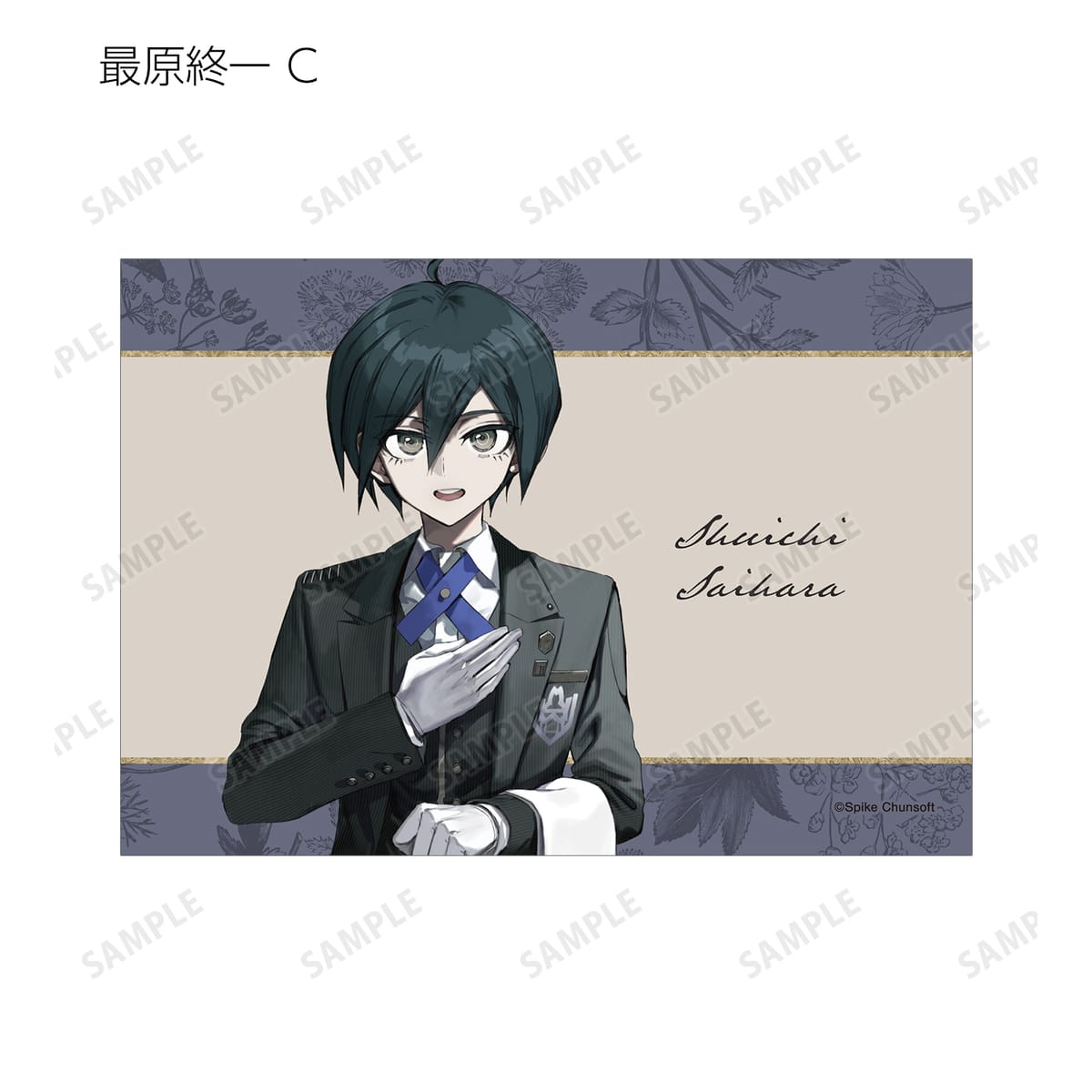 緜先生描き下ろしイラストの苗木誠、霧切響子、セレスティア・ルーデンベルク、江ノ島盾子、日向創、狛枝凪斗、七海千秋、カムクライズル、赤松楓、天海蘭太郎、王馬小吉、最原終一、キャラクターの名前をブロマイド3枚セットに仕上げました。