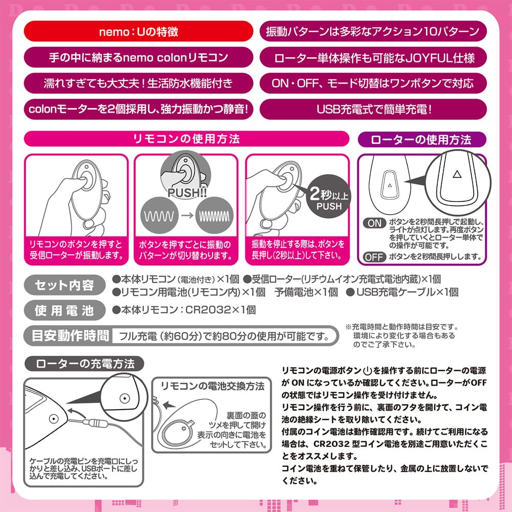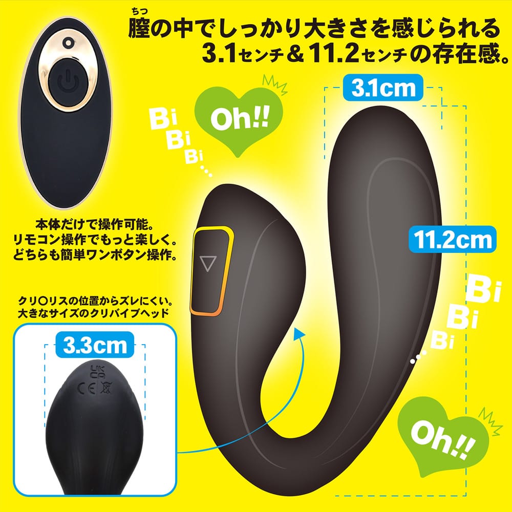 気持ちいい位置にぴったりあわせてバイブできる、2点同時責めリモコンバイブの登場です。振動モーターは2個。挿入バイブには強力モーターを、クリバイブにはソフトモーターを内蔵し、最適な刺激が楽しめます。挿入バイブは「膣の中でしっかり存在感」を感じられる大きさに、クリバイブは使用中に少しくらいズレてもクリへの刺激が続く大きさに設計。10メートル離れても操作できるから使い方は自由自在。リモコンでもローター単体でも操作可能。10種類の動作パターン。本体の表面はソフトシリコンで肌ざわりもすべすべ。・USB充電式・フル充電で最大80分可動・生活防水。≪ご使用上の注意事項≫1:リモコン付属の電池と予備の電池は動作確認用です。お早目に新しい物にお取替え下さい。2:振動させていなくてもローターは電波受信の為に電池を消費しています。使用後は必ず電源をOFFにして保管して下さい。3:リモコン用電池の絶縁体を取り外してからご使用ください。4:本体を無理に引っ張ったりすると故障する恐れがあるのでおやめください。