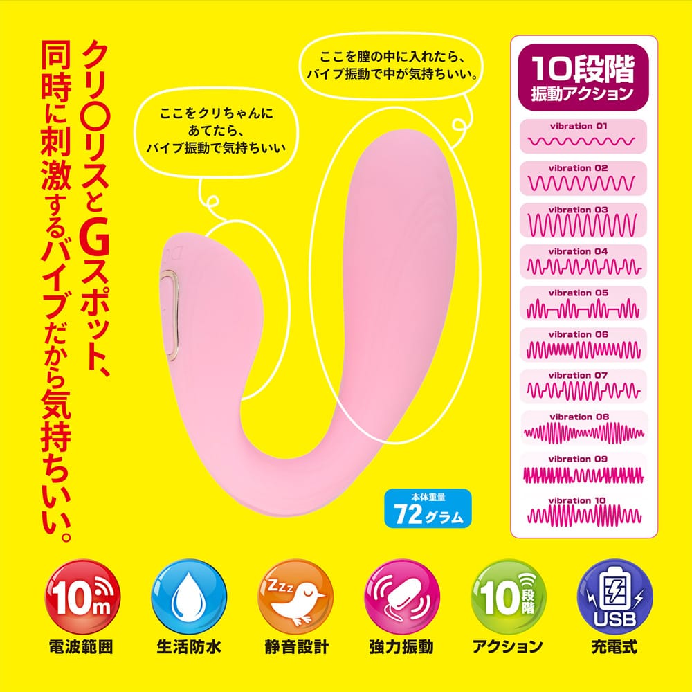 気持ちいい位置にぴったりあわせてバイブできる、2点同時責めリモコンバイブの登場です。振動モーターは2個。挿入バイブには強力モーターを、クリバイブにはソフトモーターを内蔵し、最適な刺激が楽しめます。挿入バイブは「膣の中でしっかり存在感」を感じられる大きさに、クリバイブは使用中に少しくらいズレてもクリへの刺激が続く大きさに設計。10メートル離れても操作できるから使い方は自由自在。リモコンでもローター単体でも操作可能。10種類の動作パターン。本体の表面はソフトシリコンで肌ざわりもすべすべ。・USB充電式・フル充電で最大80分可動・生活防水。≪ご使用上の注意事項≫1:リモコン付属の電池と予備の電池は動作確認用です。お早目に新しい物にお取替え下さい。2:振動させていなくてもローターは電波受信の為に電池を消費しています。使用後は必ず電源をOFFにして保管して下さい。3:リモコン用電池の絶縁体を取り外してからご使用ください。4:本体を無理に引っ張ったりすると故障する恐れがあるのでおやめください。
