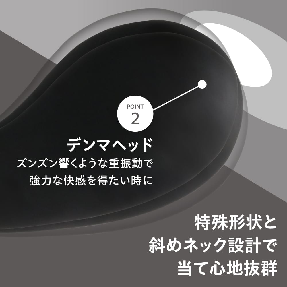 ピンポイント刺激とズンズン電マ刺激の両方を楽しめる勾玉型の可愛いデンマです。2WAYヘッドが特徴でネックに少し角度をつけているのでセルフプレイにも最適です。上質で静音×高速振動モーターを採用した振動パターンは強弱調整を細かく5段階+実用性の高い5つの振動パターンの計10パターンをお楽しみ頂けます。オールシリコンボディの優しくしっとりとした感触がストレスフリーな使用感を演出します。120分充電で最大60分の連続使用が可能です。(使用環境により大幅に増減します。)IPX6の高レベル防水だからしっかり洗えて衛生的に長くお使い頂けます。