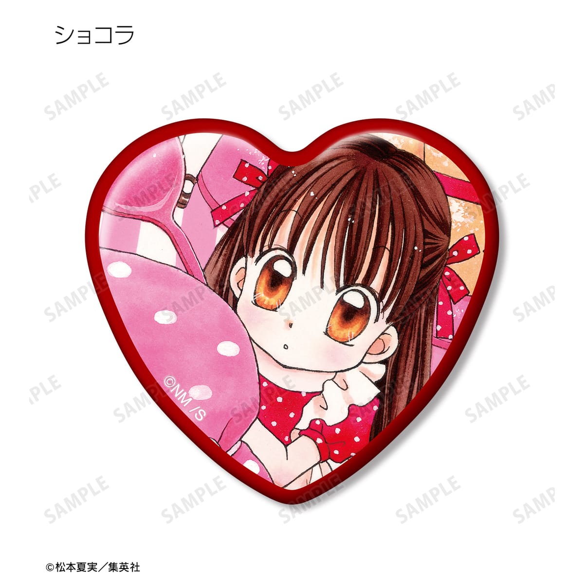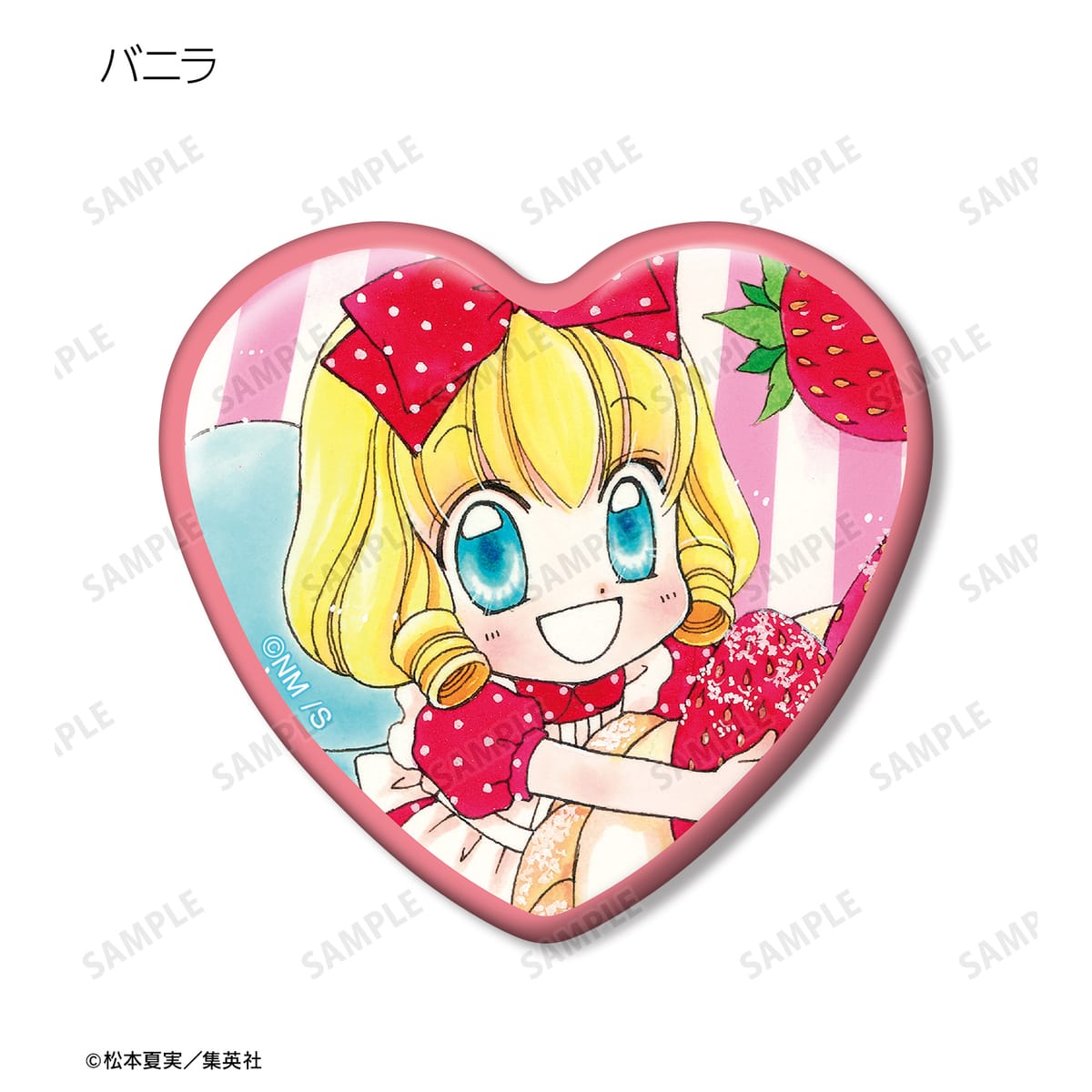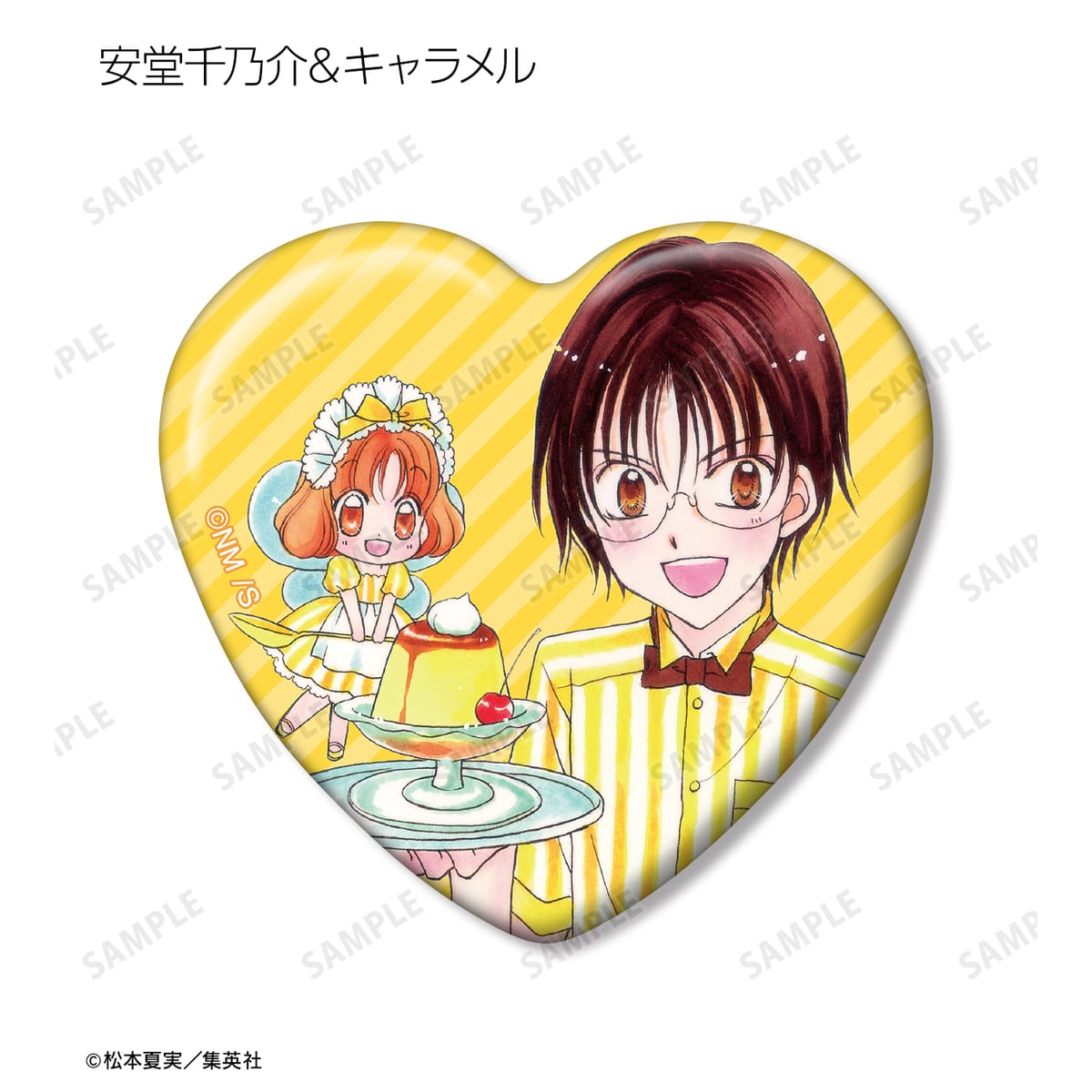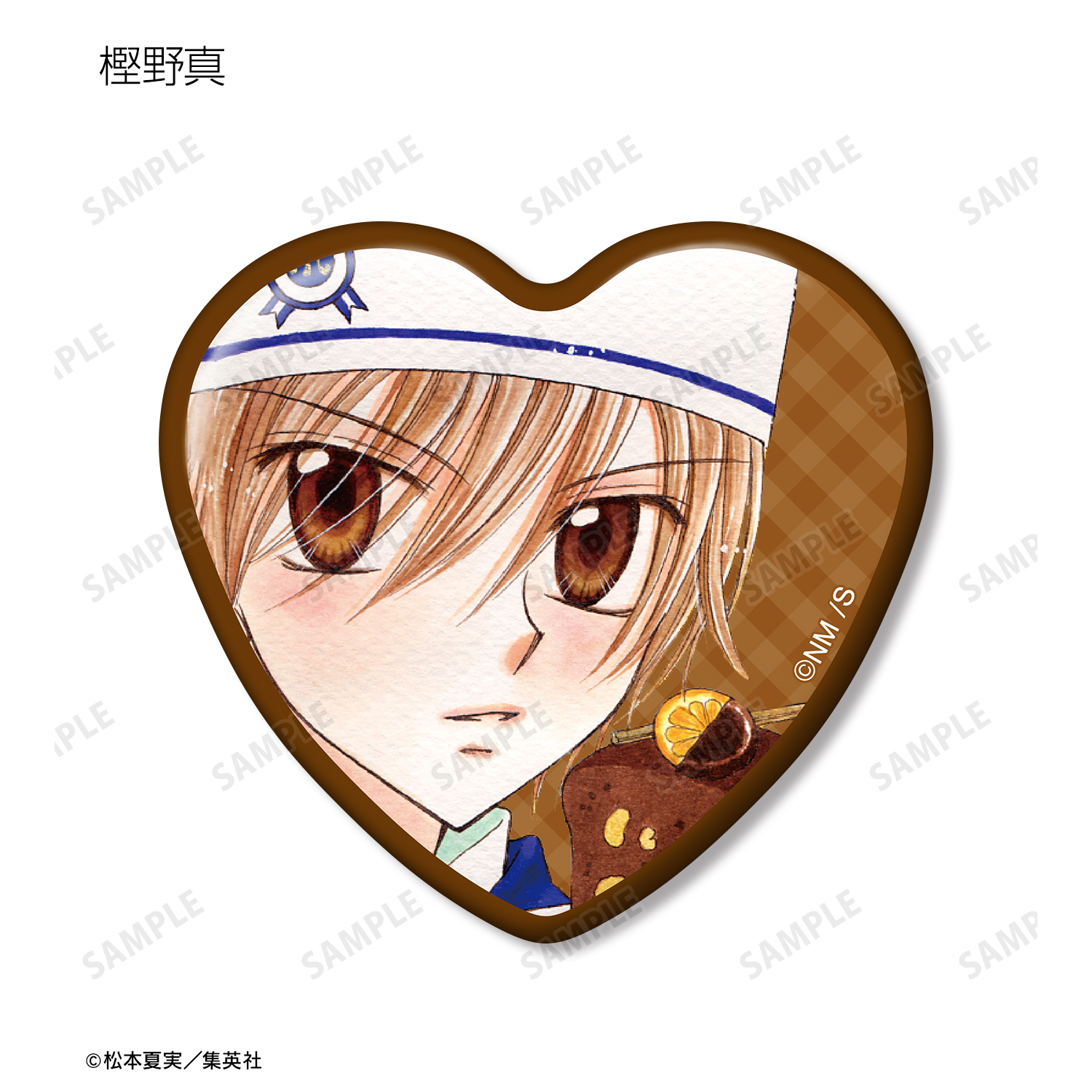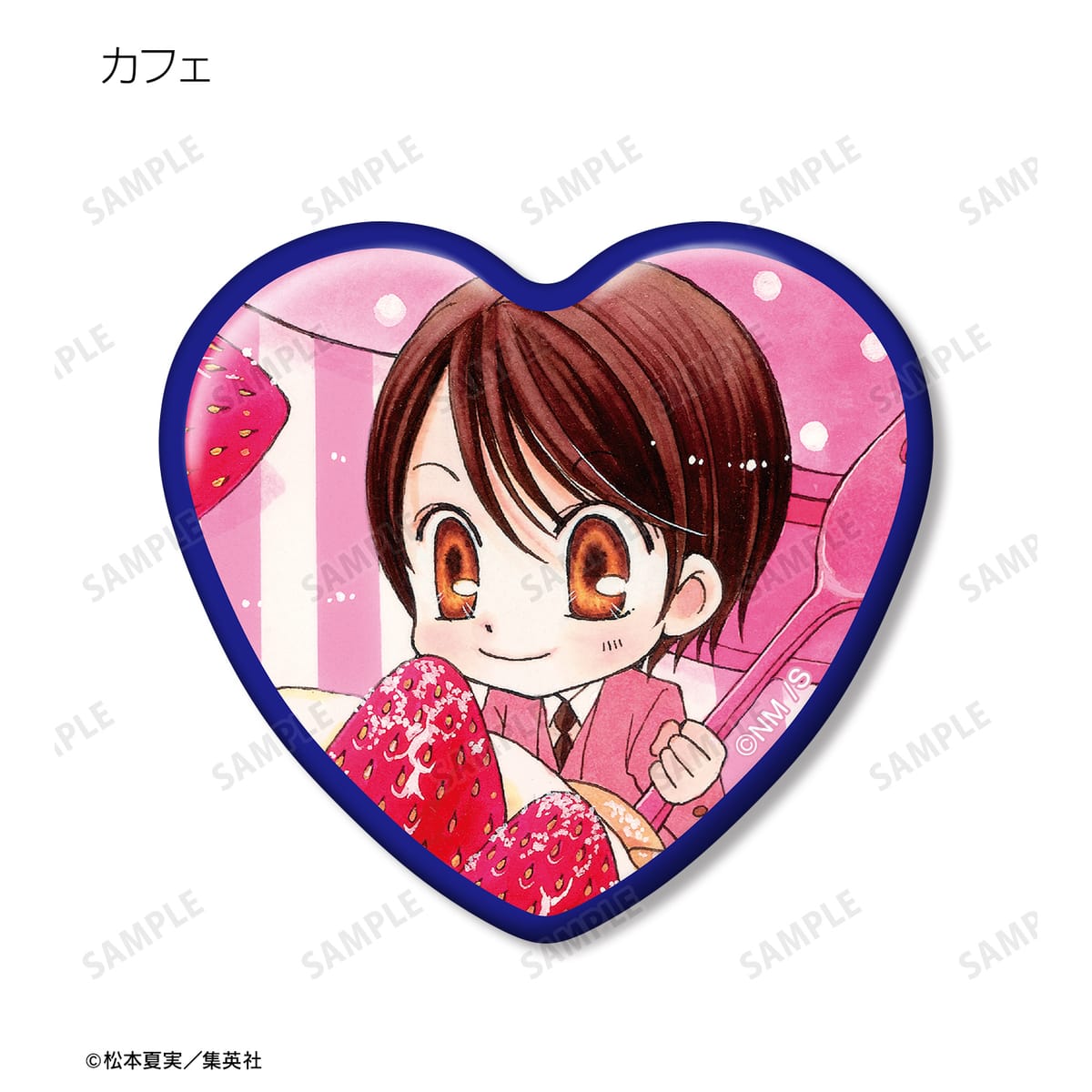 天野いちご、樫野真、安堂千乃介、花房五月、バニラ、ショコラ、キャラメル、カフェの原作イラストをハート型の缶バッジに仕上げました。