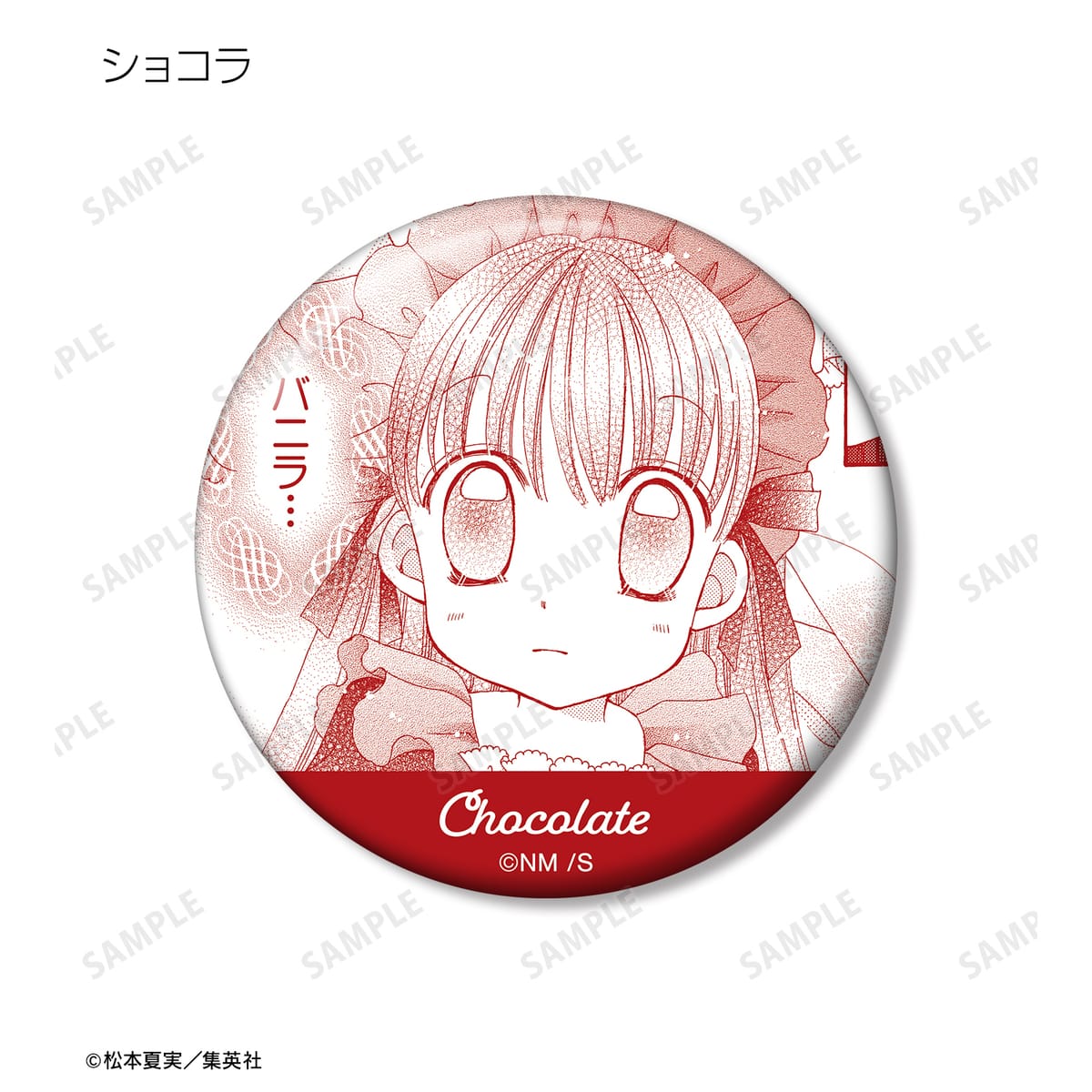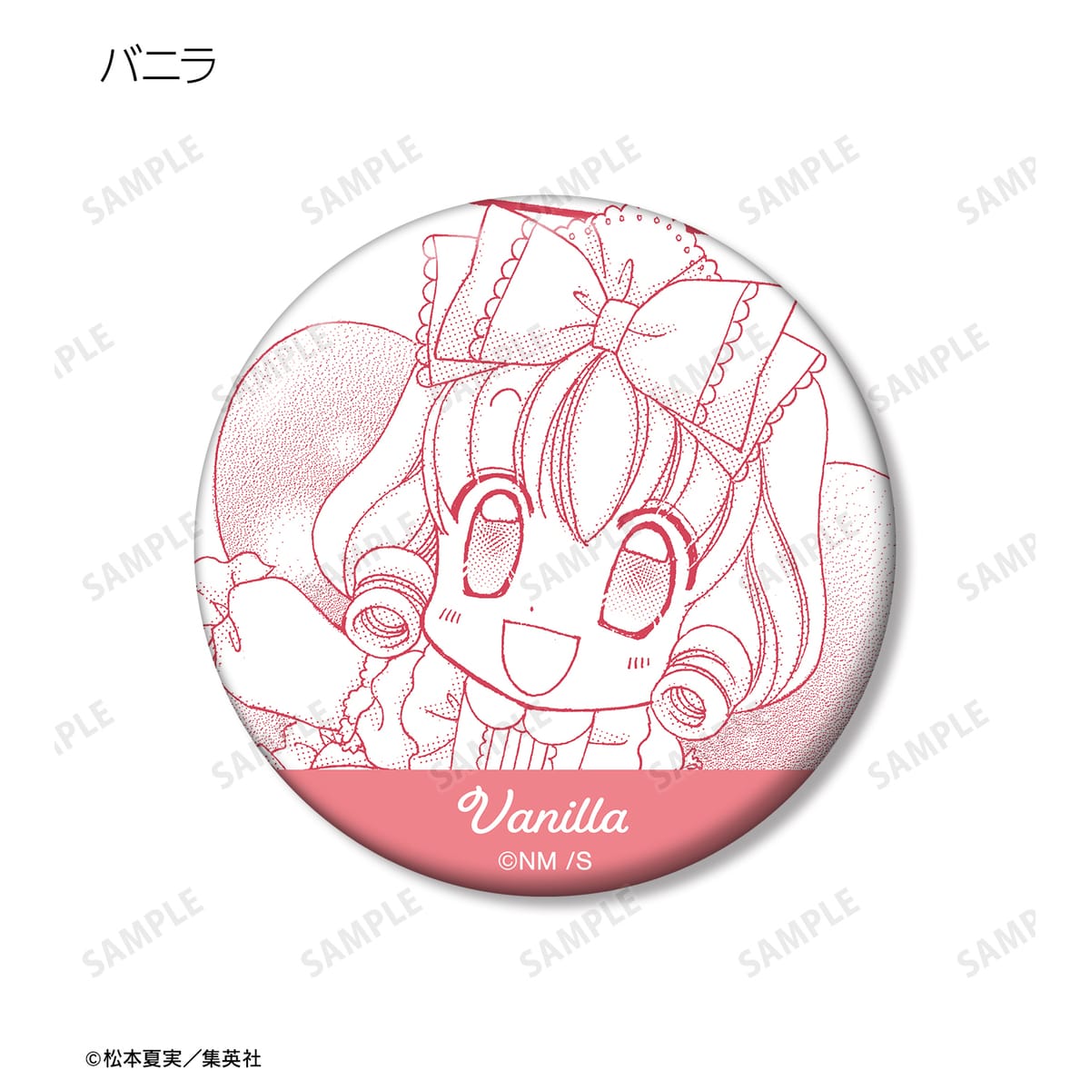 天野いちご、樫野真、安堂千乃介、花房五月、バニラ、ショコラ、キャラメル、カフェの原作コマイラストを缶バッジに仕上げました。