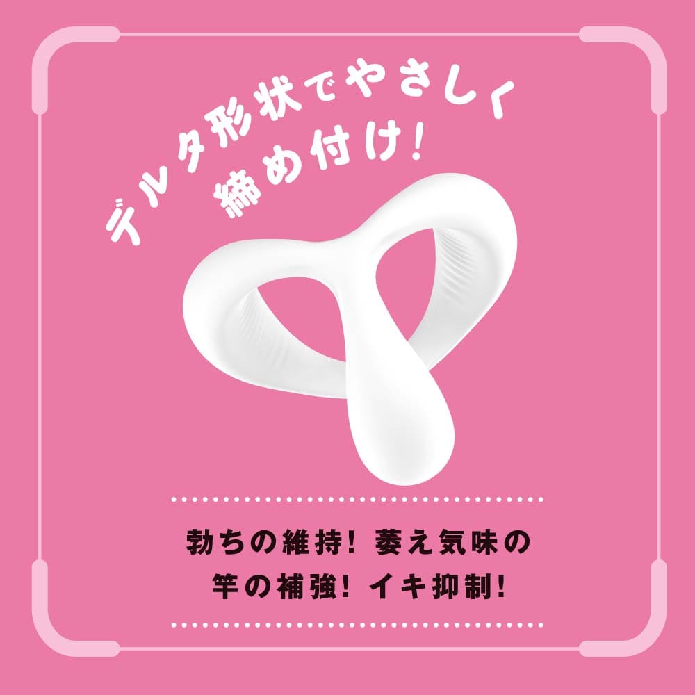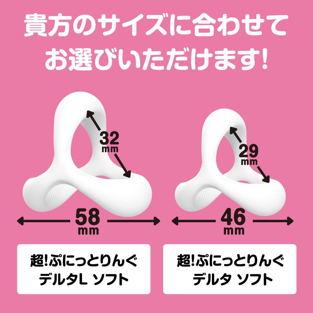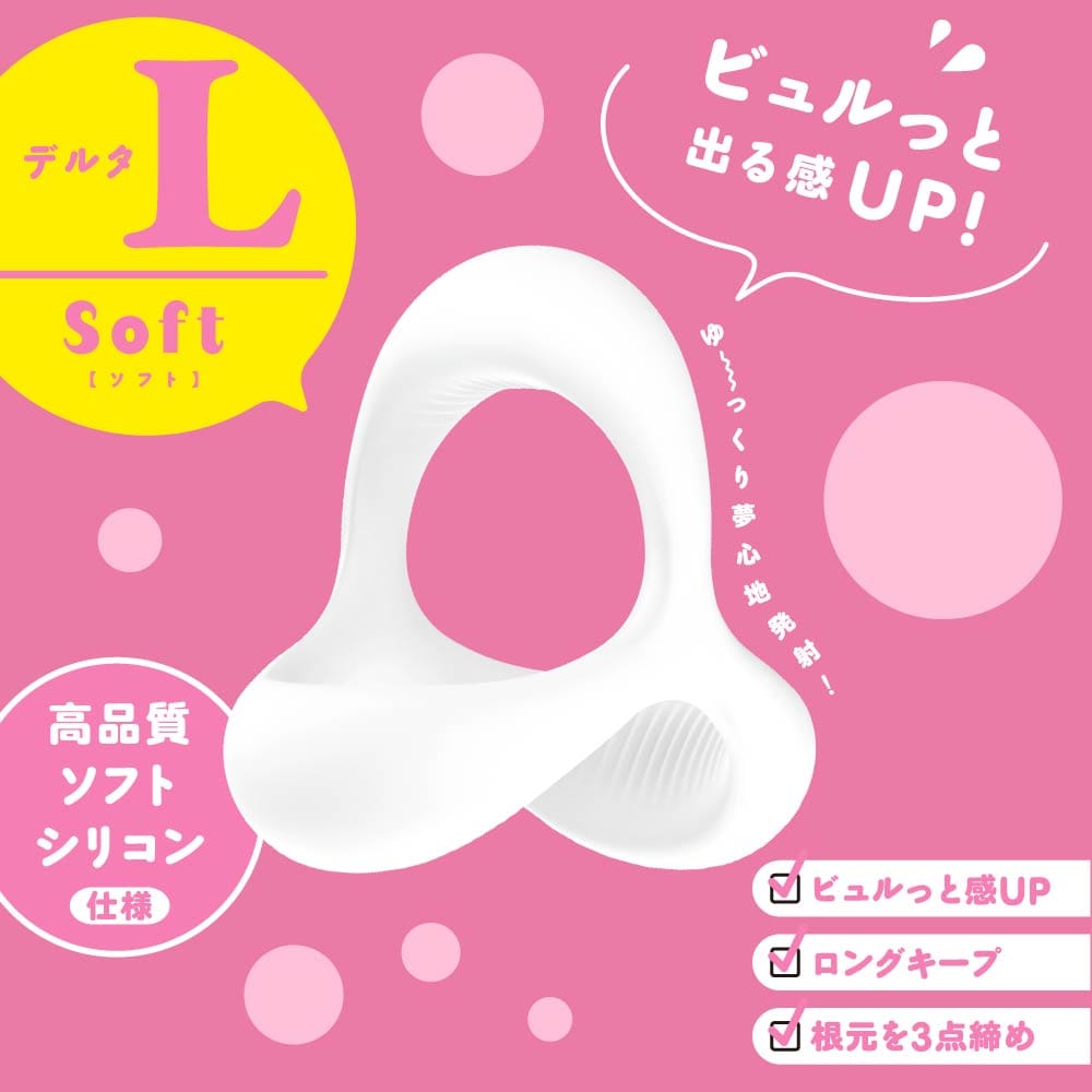 超!ぷにっとりんぐデルタにLサイズが登場!サイズに合わせて選択ができるようになりました。サッと装着♪ピタッと密着!根元を3点締めしてくれるデルタ形状のソフトverです。臭いのない高品質ソフトシリコンで着けてるストレスを軽減!デルタ形状でやさしく締め付け!勃ちの維持!萎え気味の竿の補強!イキ抑制!フィット面に施された滑り止めがズレを軽減し、皮戻り防止にも便利です。ビュルっと出る感UPでゆ~っくり夢心地発射!