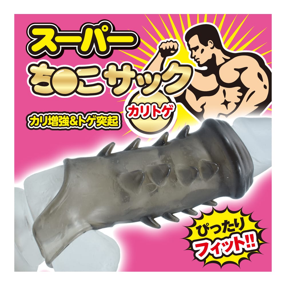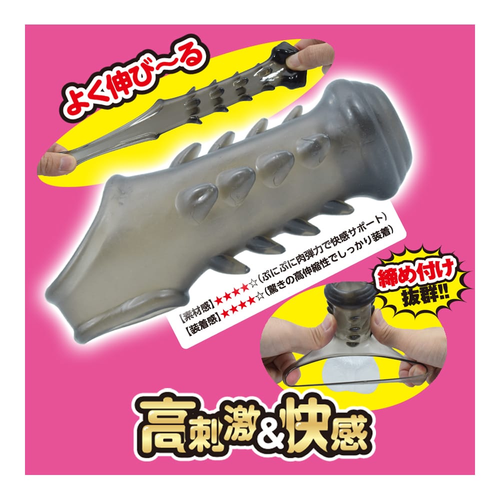 夜もがんばリング、で大人気のやわらかメンズリング「ち●こリング」シリーズに、スーパーなサックが新登場!今度のち●こサックは「カ●首&トゲトゲが付いたメンズサック」!立体感のある凹凸造形が、他にはないスーパーな快感を生み出します!ぷにぷにっとした柔らかなTPE(エラストマー)素材は、ぐい~んとよく伸びる高伸縮性!サイズ問わずでどんな大きさでもしっかりフィットの抜群の装着感&締付感!男らしさを引き立たせるスモークカラー!「カ●&トゲ」は、カ●首の強化となる造形と、アグレッシブなトゲトゲ配置!先端部の膨らみは、カ●首をパワフルに!全16本もあるトゲトゲは、攻撃的な快感に!アナタをスーパーに変身させるはず!ほとばしるストロング、みなぎるパワー!