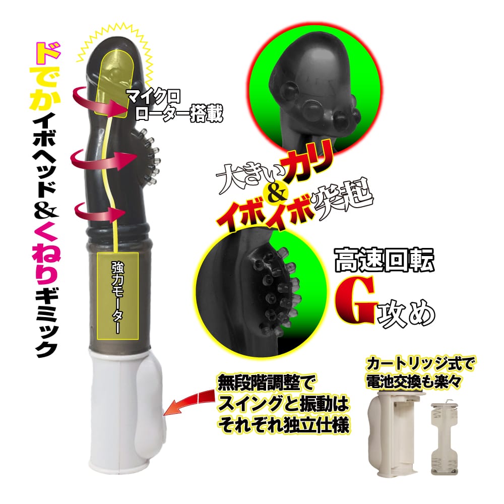 限界突破!くねりギミック搭載でG攻め激イキバイブ!最大径約42mmの極太カ●にイボイボ突起搭載!ぐりぐり ぐねぐねとヘッドの動きに我慢の限界。内臓されたマイクロバイブの強振動で内壁を超刺激まさしく限界突破!カ●の下には、G攻め用のイボイボ突起の集団が待ちかまえる。リズム感ばっちりのくねりギミック&6Vパワーの高速回転、刺激の応酬で潮吹き激イキ間違いなし!電池を入れればすぐに使える楽々コントロールBOX。無段階調整スイッチでお好みの速度と振動でお楽しみいただけます。単4電池4本使用(アルカリ乾電池推奨)静音タイプ