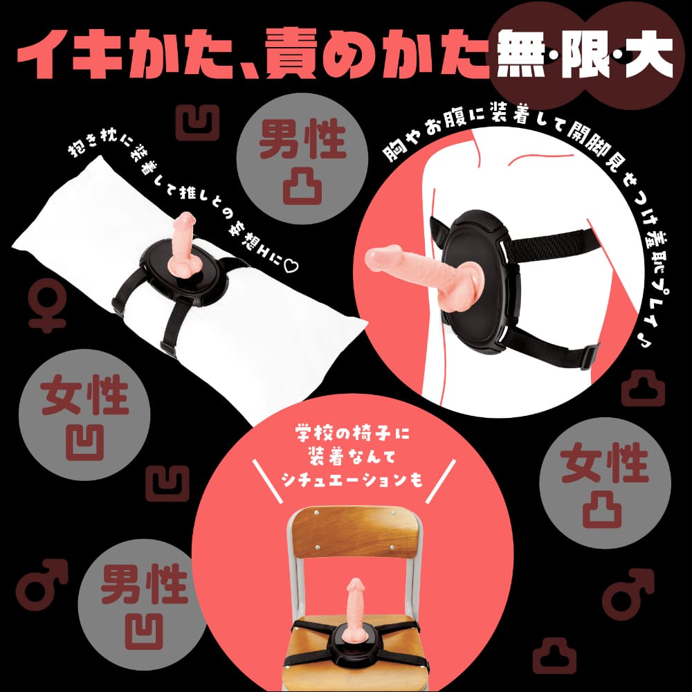 イキかた、責めかた、∞(無限大)!! フラット盤で乗り手が動くのに特化したペニバンです!吸盤式のディルドを平らな面でしっかり固定できる安定設置、吸盤の吸着が抜群で幅広いサイズに対応可能です!ワンタッチバックル仕様なので装着が簡単!2点留めで色々なものに装着できます。勃たない時のフォローに良し!抱き枕に装着して推しとの妄想Hに使っても良し、学校の椅子に装着なんてシチュエーションや、胸やお腹に装着して開脚見せつけ羞恥プレイまで使い方も無限大♪男性凸女性凸男性凹女性凹色んな組み合わせが楽しめる!装着周囲74cm~109cmまで調整が可能です。使用後も拭き取るだけでお手入れ楽々!ベルトを外して水洗いもOKなので汚れ落としが簡単です♪※ディルド・ローターは付属しておりません。ぷにっとりあるディルドの使用をオススメいたします!※直接装着すると傷や怪我の恐れがございますので、タオル等を挟んで使用することをおすすめいたします。