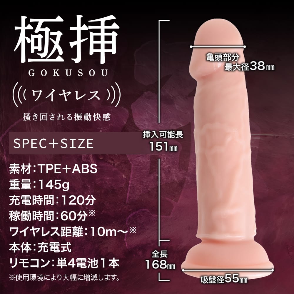 極上の挿入感が楽しめる大人気リアルディルドシリーズ【極挿】にワイヤレス操作可能な電動タイプが登場。リアルな感触の高品質素材はそのままに豪快なスイングアクション機構と高性能ヘッドモーターを搭載。強弱5段階を細かく調整出来て、さらに実用性の高い7パターンの振動を設定。合計12パターンのスイング振動快感で普段味わえないような心地良い奥イキを実現しました。全長168mmのストレートタイプだからお好みに合わせて挿入快感が楽しめます。壁や床にしっかりと固定出来る直径55mmの吸盤付き(振動の強さで固定が外れてしまう事があります)プレイの邪魔をしないコードレスタイプだからストレス無く遊んで頂けます。ワイヤレス操作可能距離は10m~(※)、自由自在な使い方が実現。120分の充電で最大60分の連続使用が可能(※使用環境により大幅に増減します。)なリチウムイオンバッテリー搭載。
