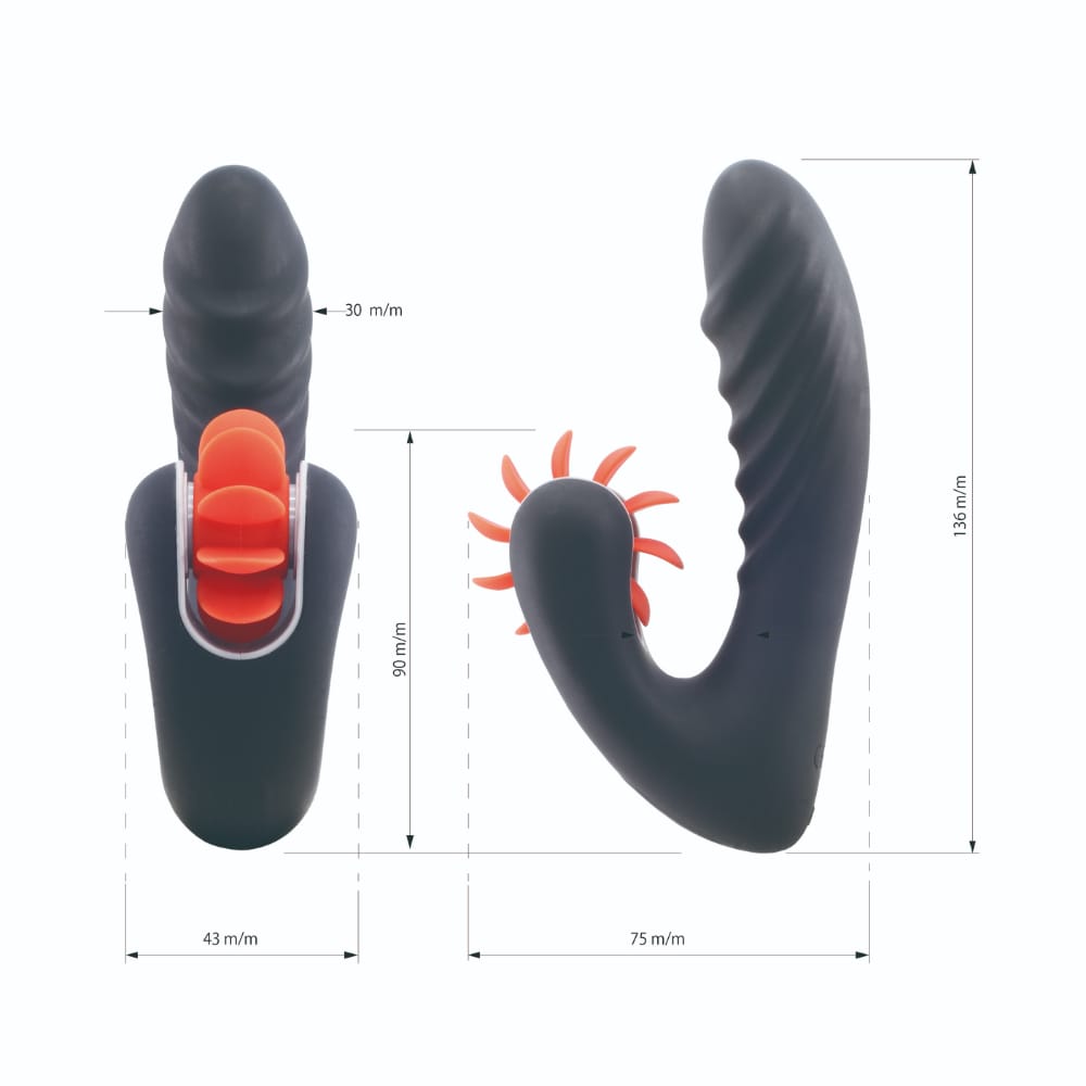 3種の強力回転と10種の強力振動。ナカイキ派もク●イキ派も満足の欲張り2点攻め!ベロりん中毒はク●ニとGス●ット刺激を同時に刺激するハイクオリティーバイブ。それぞれ単体でも使用が出来ますが、同時攻めで無限の快感が押し寄せます。風車のように回転する舌はやわらかいシリコンで出来ていて、無限にク●ト●スを舐めまわします。舐めパターンは3種類あり、好みで選んで使用が可能。リアルな先端は挿入感にこだわり、波打つ挿入部はGス●ットを強力振動で刺激します。挿入部はヒート機能が搭載されているので、人肌程度まで温まり、よりリアルさを追求しています。挿入時に暖かいと感じる本物志向のバイブです。操作はそれぞれセパレートのボタンなので、お好みの回転と振動をたのしんでください。プレミアムシリコンを使用し、肌触りもスベスベ。完全防水なので水洗い可能。水洗い後はタオルなどでしっかりと水気を取ってください。