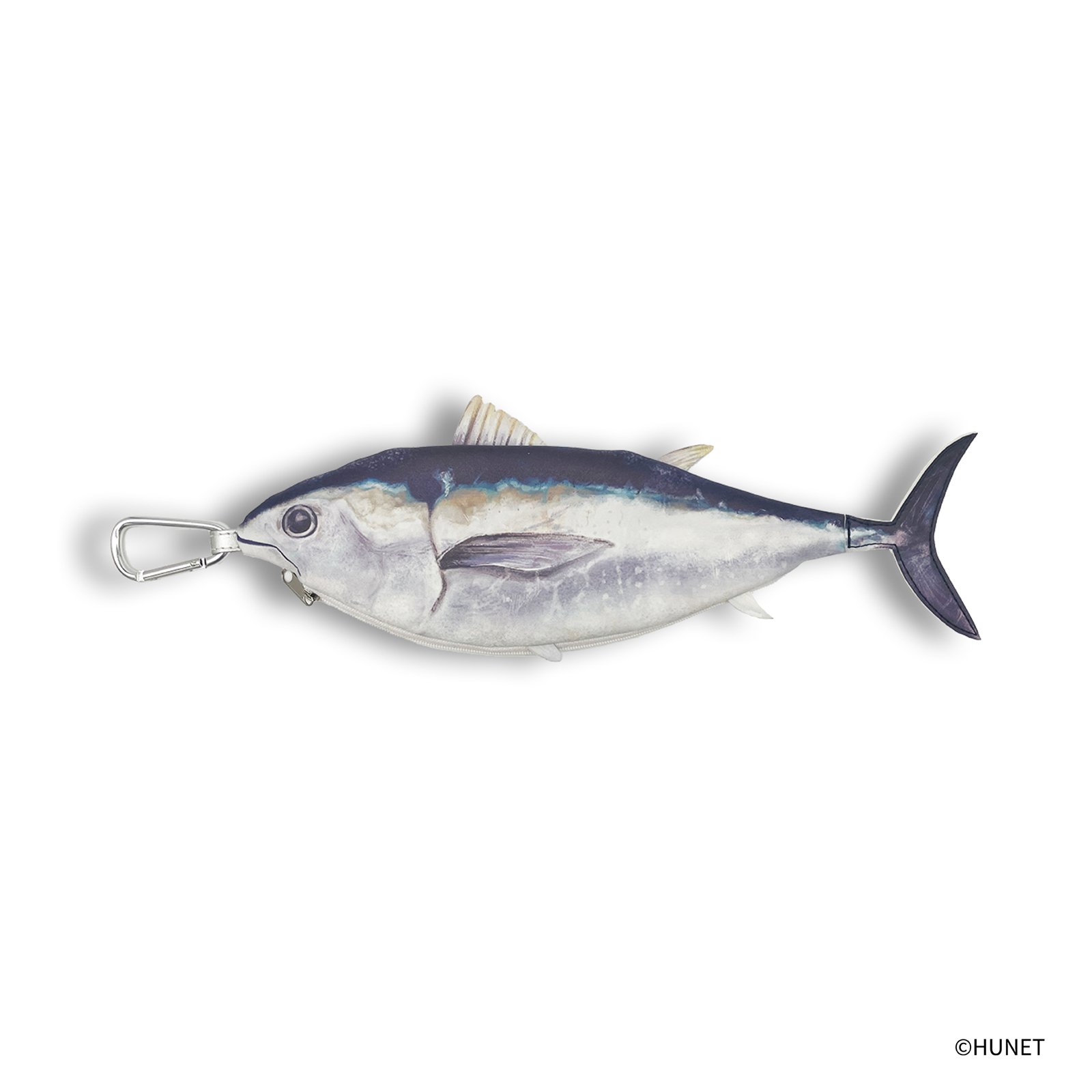 リアルなプリントを施したポーチにおさかなテーマの総柄プリントが入ったエコバッグを収納できます。