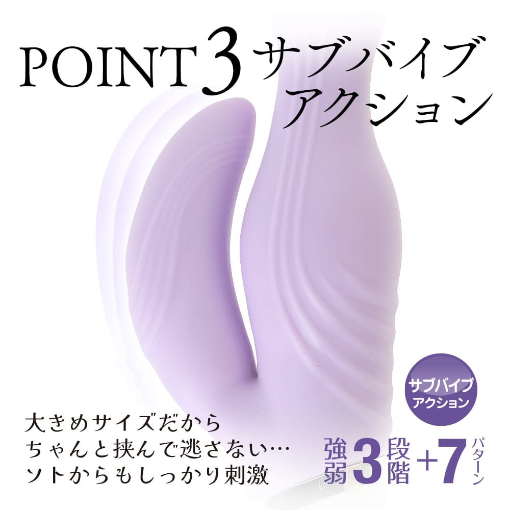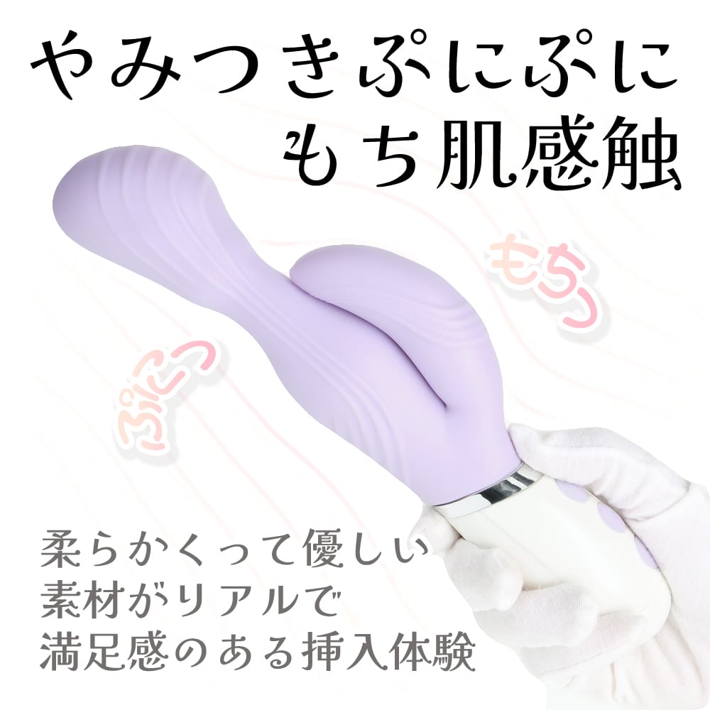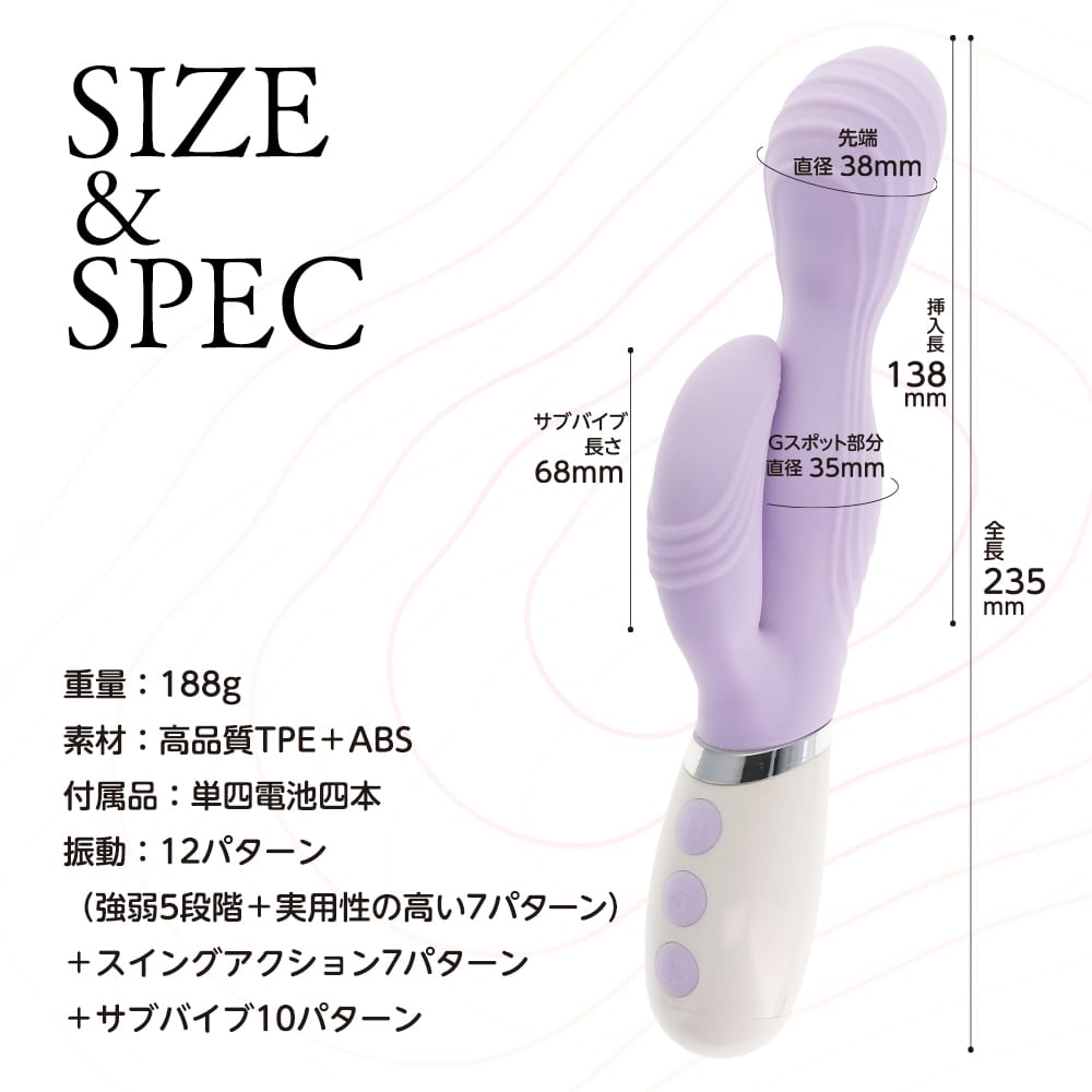 モチ肌感触がクセになる、柔らか高品質素材採用バイブ。スイング+高性能ヘッドモーター搭載だからナカ派も大満足。しっかりと擦れる快感を楽しめる形状のサブバイブにもパワフルモーターを搭載しています。不思議な感触の柔らか素材が優しい気持ち良さを演出します。ヘッドバイブは強弱を細かく5段階調整+実用性の高い7パターンを採用、計12パターン+スイングアクション7パターン+サブバイブも10パターンもあるのでお好みの刺激を選んで楽しめます。満たされ感の強い先端形状とG部分にも膨らみを付けて、より充実した挿入感を実現しました。実用的なアクションと挿入感に特化した形状と高品質柔性素材の全部盛りバイブです。