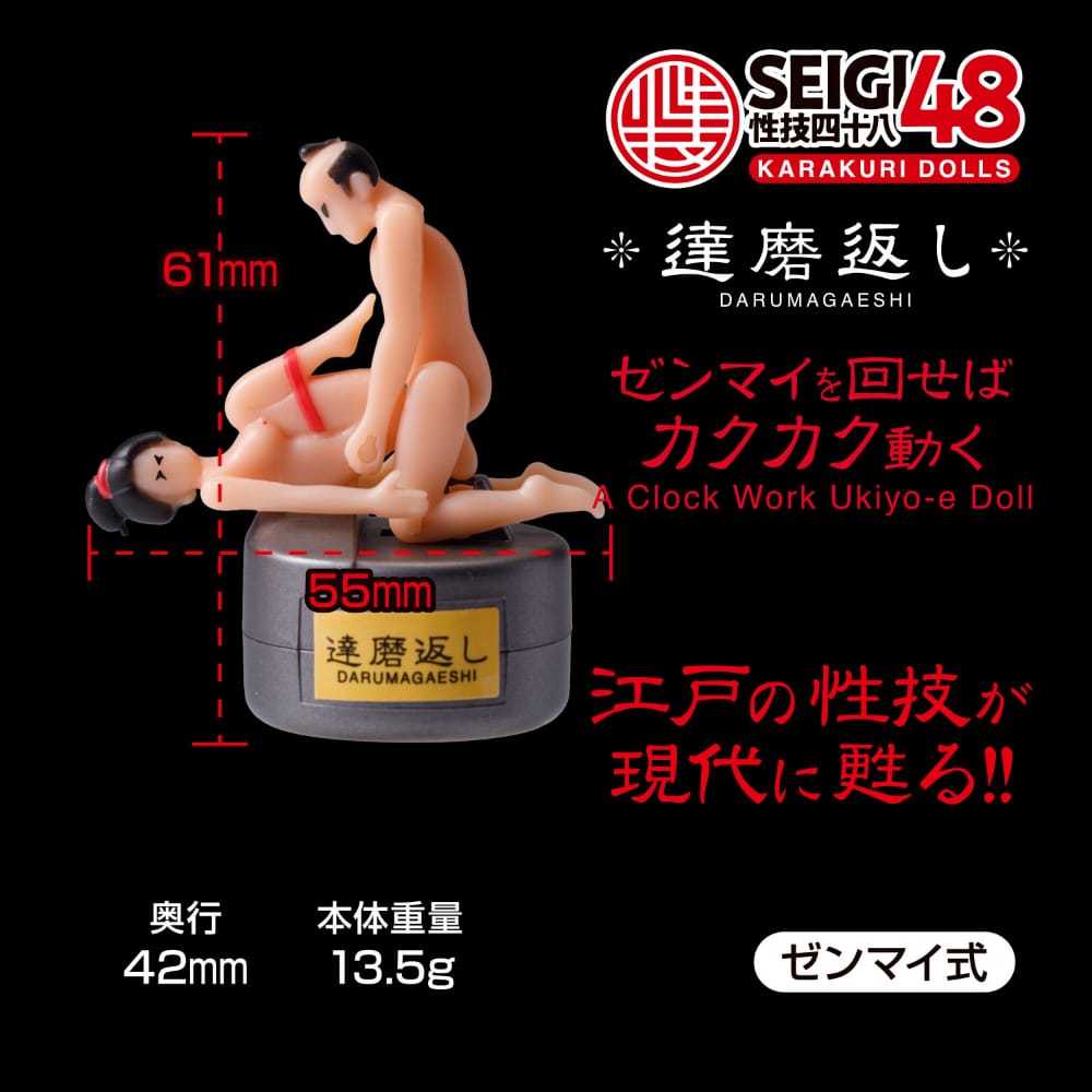 江戸の粋と笑いがゼンマイで動き出す!浮世絵に描かれた"性技四十八手"を、まさかのからくり人形で再現!?その名も『SEIGI48KARAKURIDOLLS』です。ゼンマイを回せば、思わずクスッと笑ってしまうような、江戸の色ごとが艶やかに、そして滑稽に踊り出す。歴史とエロス、そしてユーモアが融合した、まさに"大人のためのジョークグッズ"に仕上げました。ちょっとハードな緊縛プレイの『達磨返し』、カクカクと動く様子は江戸時代にも通じる"粋"を感じるかもしれません。観賞用としても、プレゼントとしても話題性抜群!ちょっと疲れた心に、粋な笑いと艶をひとつどうぞ。