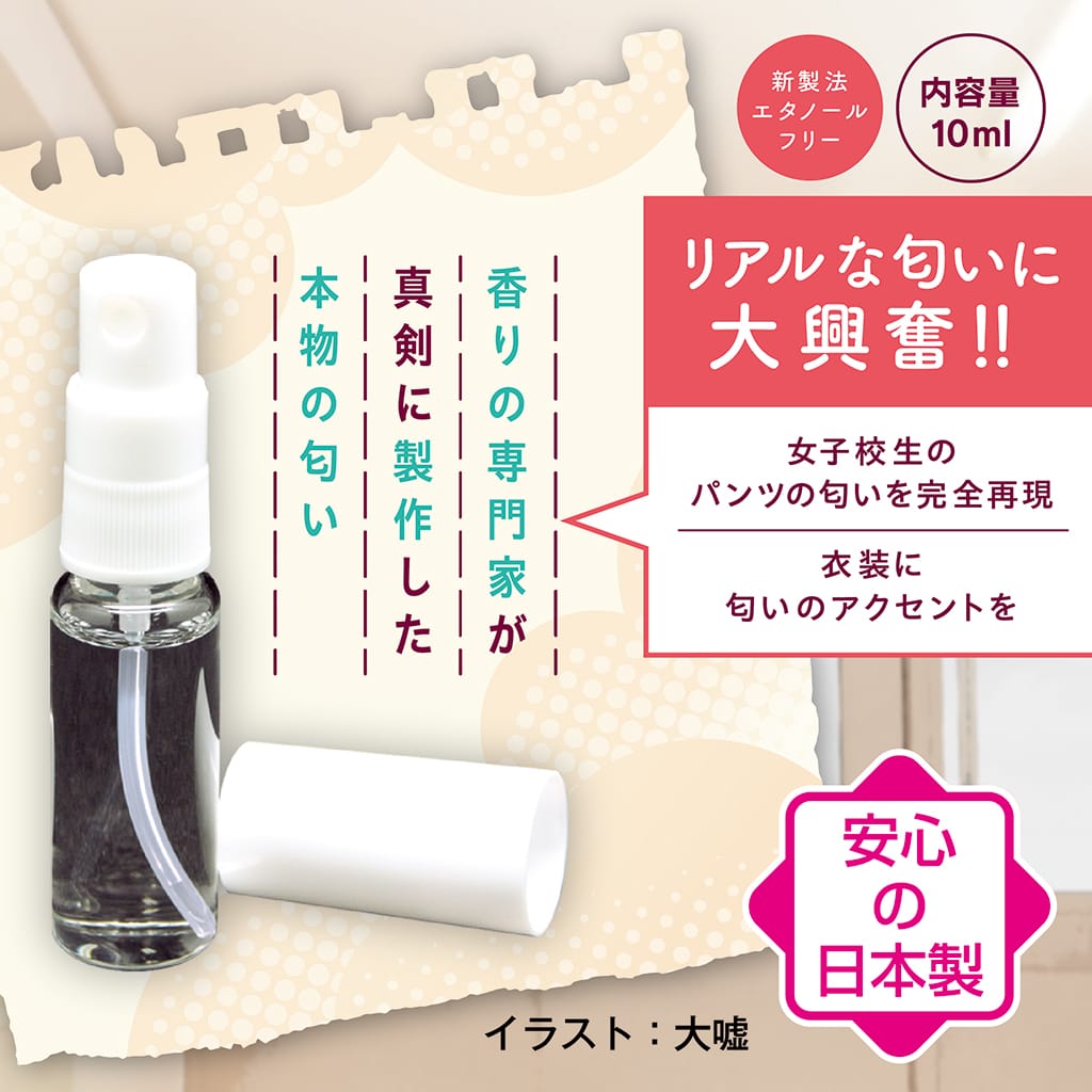 新製法エタノールフリー 女子校生のパンツの匂いを完全再現 リアルな匂いに大興奮!! 発情した女子校生の濃厚な匂い 女性フェロモンたっぷりの淫臭 匂いで感じる新感覚 あのとき感じたあの匂いをもう一度 女性の特有の匂いを詰め込んだ香りグッツ 衣装に匂いのアクセントを 内容量10ml 香りの専門家が真剣に製作した本物の匂い 日本製 イラスト:大嘘