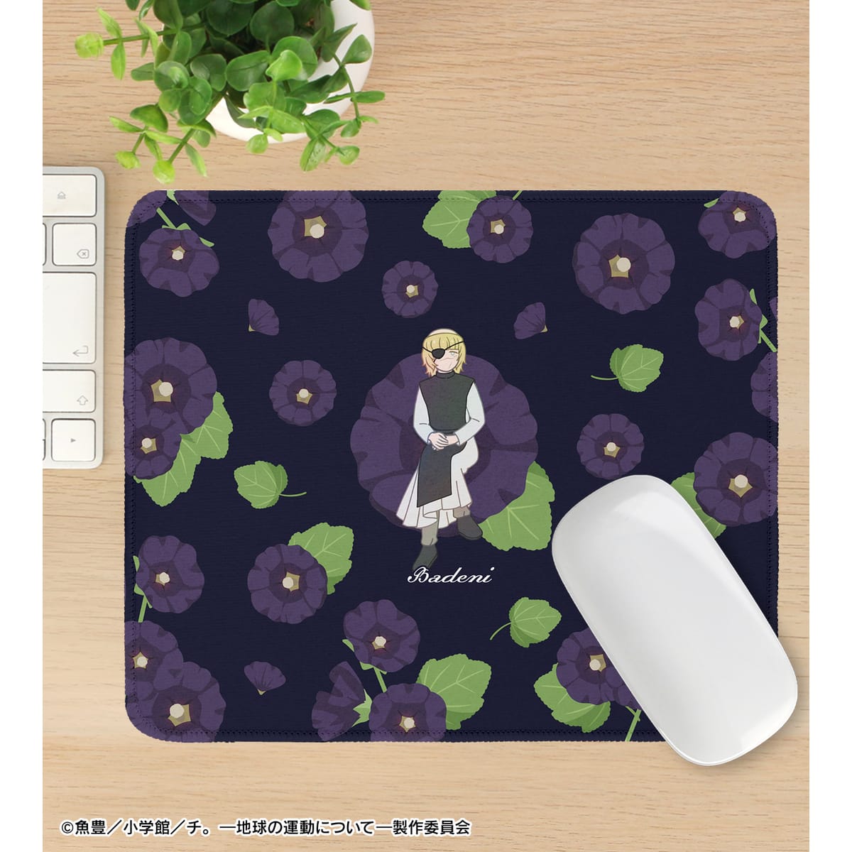 バデーニのイラストをボタニカルデザインに落とし込んで繊細なタッチで新たに描き起こし、マウスパッドに仕上げました。