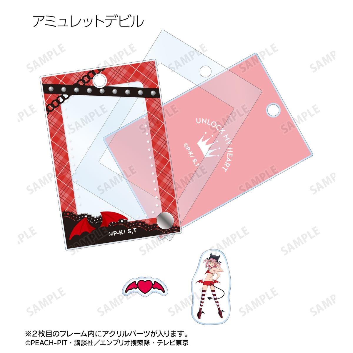 アミュレットハート、アミュレットスペード、アミュレットクローバー、アミュレットダイヤ、アミュレットフォーチュン、アミュレットエンジェル、アミュレットデビルのイラスト、ランのしゅごたま、ミキのしゅごたま、スゥのしゅごたま、ダイヤのしゅごたま、リボン、天使の羽、悪魔の羽のモチーフを、パーツ付きのフレームアクリルチャームに仕上げました。