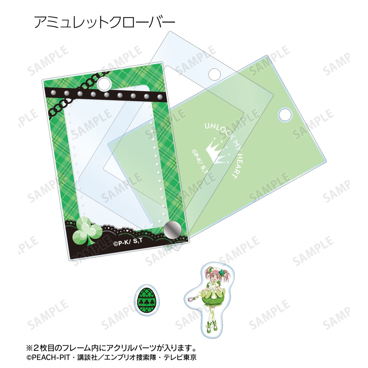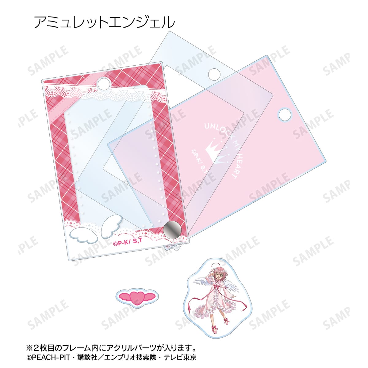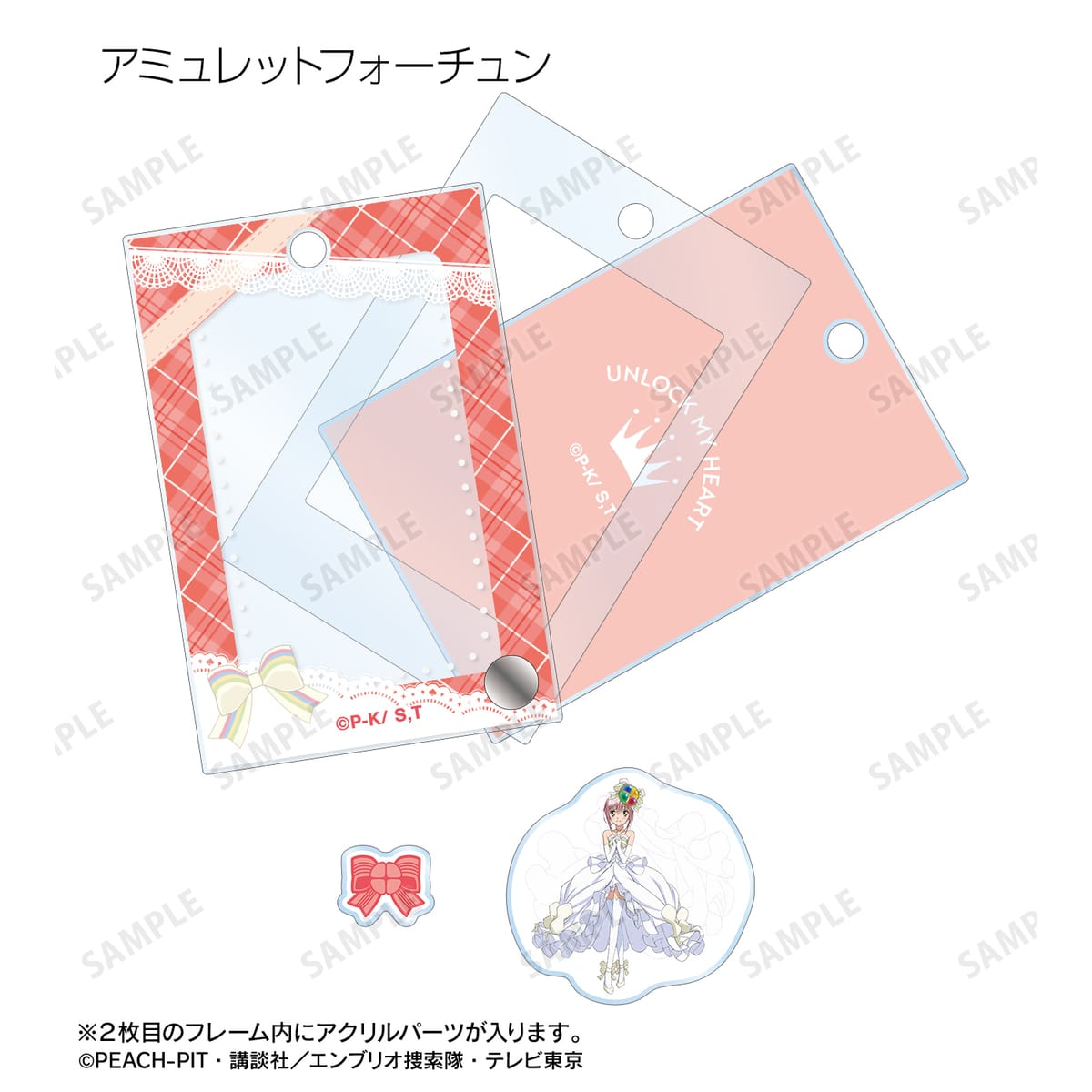 アミュレットハート、アミュレットスペード、アミュレットクローバー、アミュレットダイヤ、アミュレットフォーチュン、アミュレットエンジェル、アミュレットデビルのイラスト、ランのしゅごたま、ミキのしゅごたま、スゥのしゅごたま、ダイヤのしゅごたま、リボン、天使の羽、悪魔の羽のモチーフを、パーツ付きのフレームアクリルチャームに仕上げました。