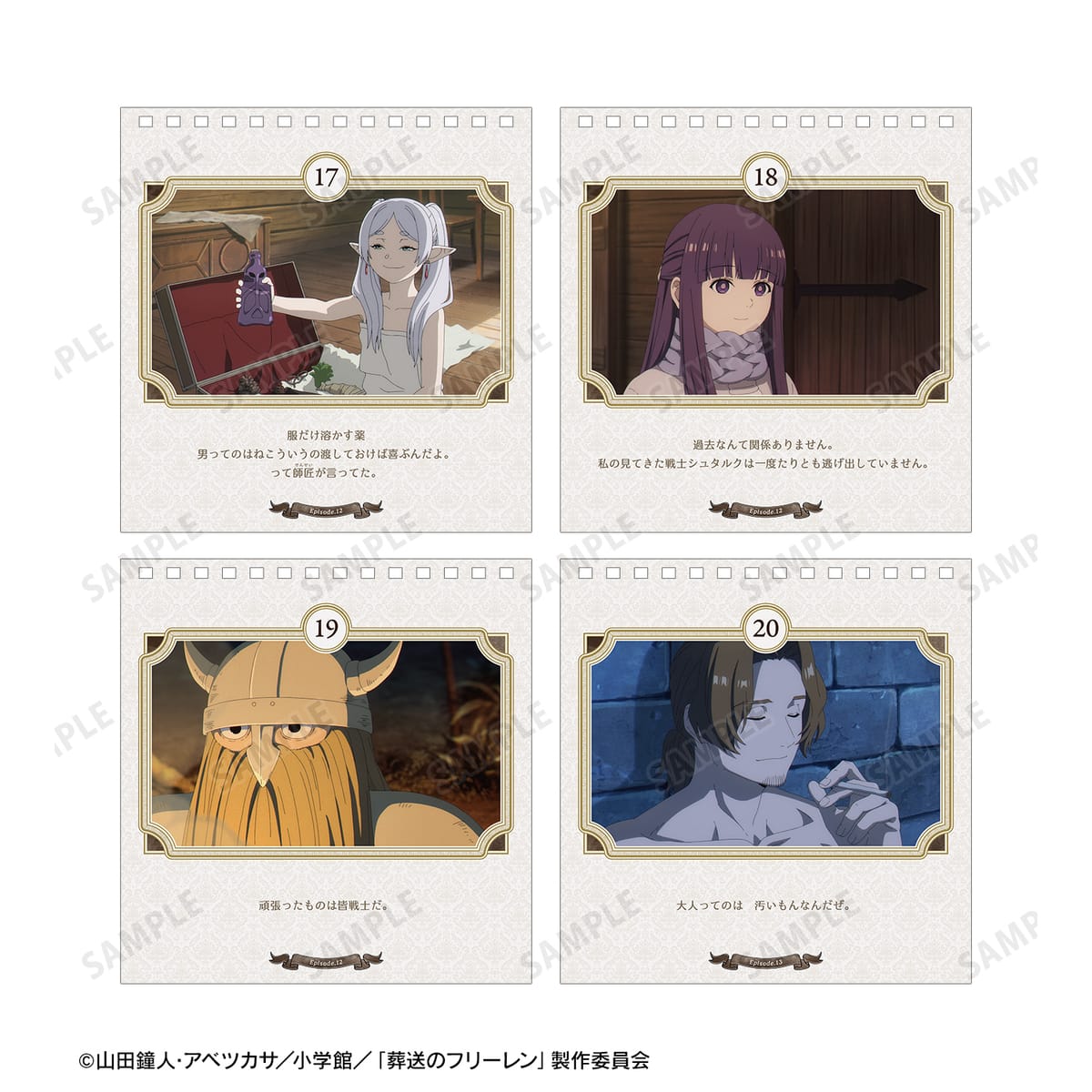 フリーレン、フェルン、シュタルク、ヒンメル、ハイター、アイゼン、ザインの印象的なシーンを日替わりでお楽しみいただける日めくりカレンダーに仕上げました。