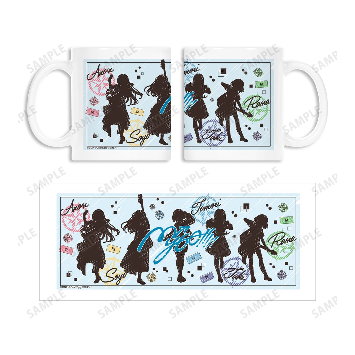 高松 燈、千早 愛音、要 楽奈、長崎 そよ、椎名 立希のイラストをスケッチ風のタッチで新たに描き起こし、マグカップに仕上げました。