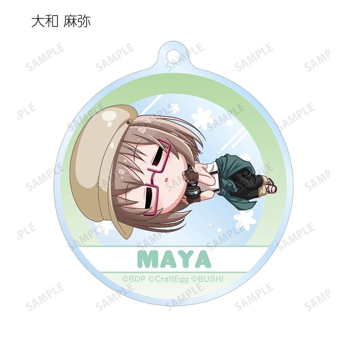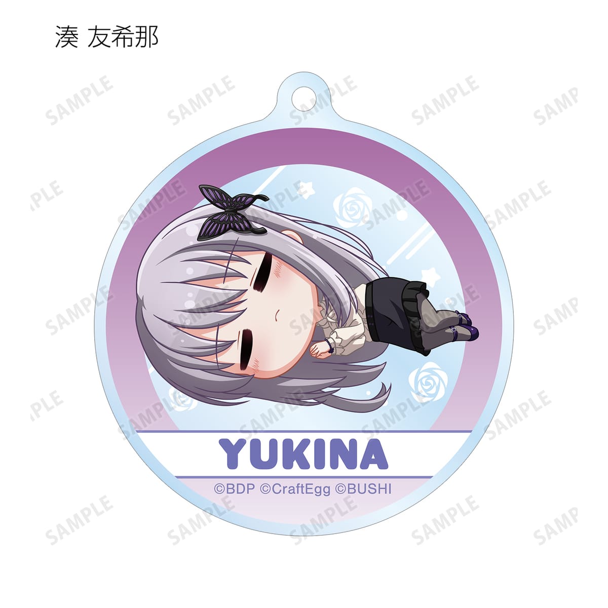 丸山 彩、氷川 日菜、白鷺 千聖、大和 麻弥、若宮 イヴ、湊 友希那、氷川 紗夜、今井 リサ、宇田川 あこ、白金 燐子がころんと寝ているちびキャラを新たに描き起こし、アクリルキーホルダーに仕上げました。