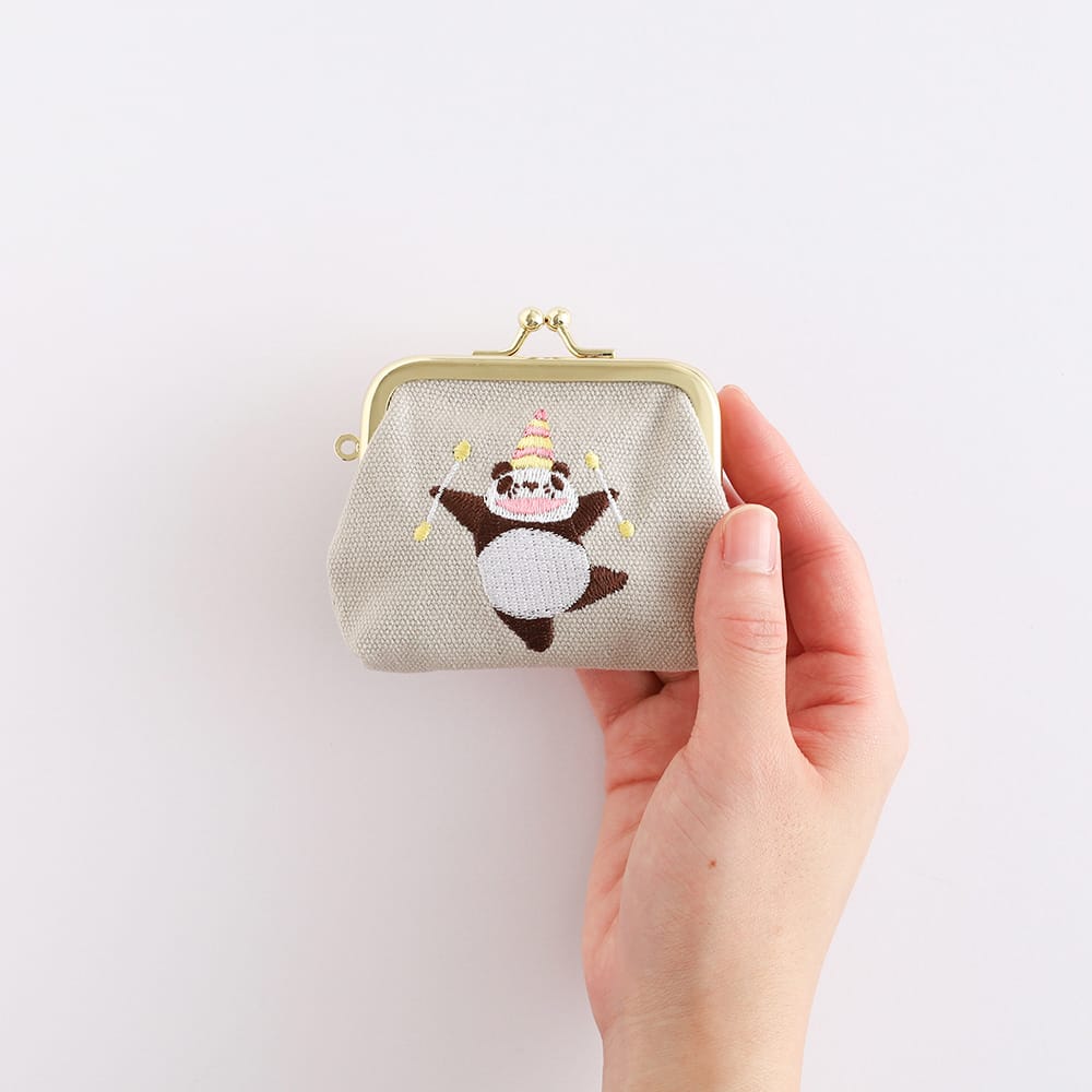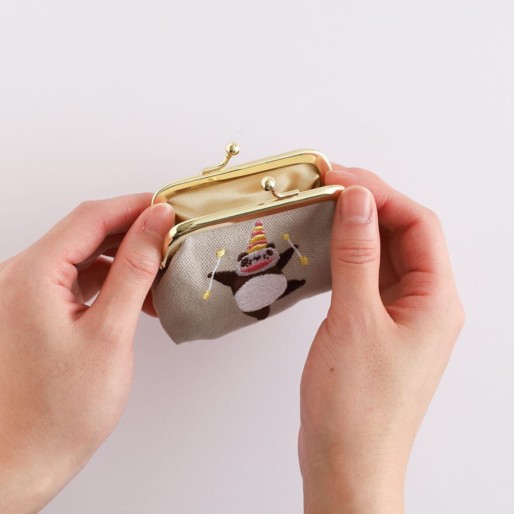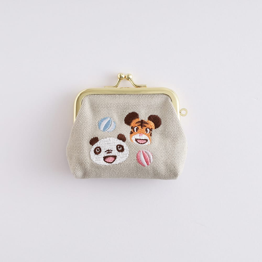 パンダコパンダの微笑ましいシーンやかわいらしい親子の様子をデザインしたシリーズ。絵柄部分が刺繍のミニサイズのがま口ポーチです。