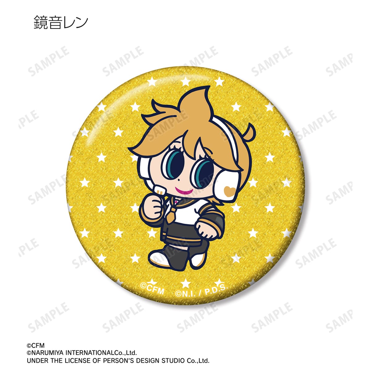 初音ミク、鏡音リン、鏡音レン、巡音ルカ、MEIKO、KAITO、ナカムラくんを描き起こしたANGEL BLUEのコラボイラストを、グリッター加工を施した缶バッジに仕上げました。