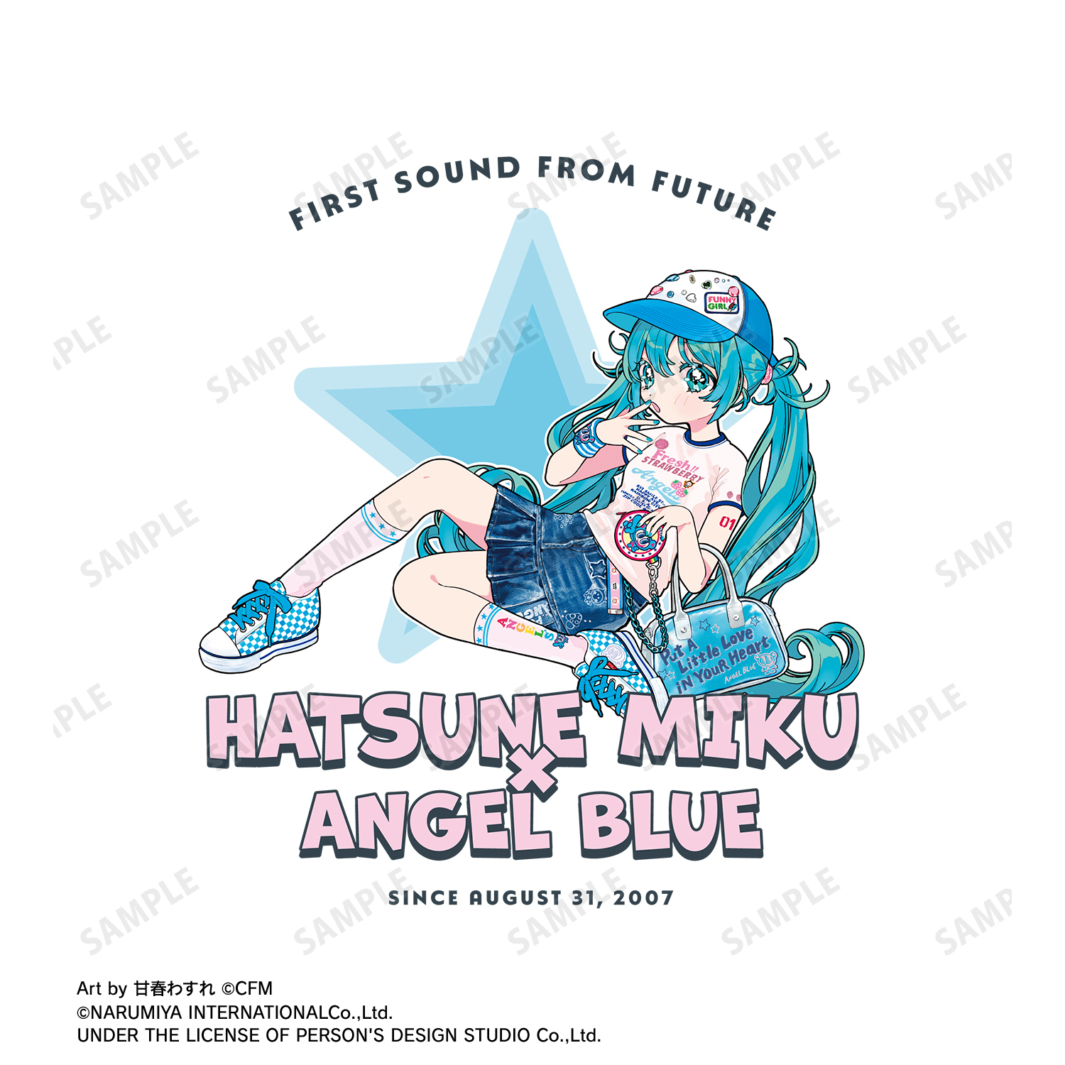 『初音ミク』×「ANGEL BLUE」のコラボレーションアイテム「ANGEL BLUEコラボ 描き下ろし 初音ミク Art by 甘春わすれ ラグランTシャツ ver.A」の登場です。