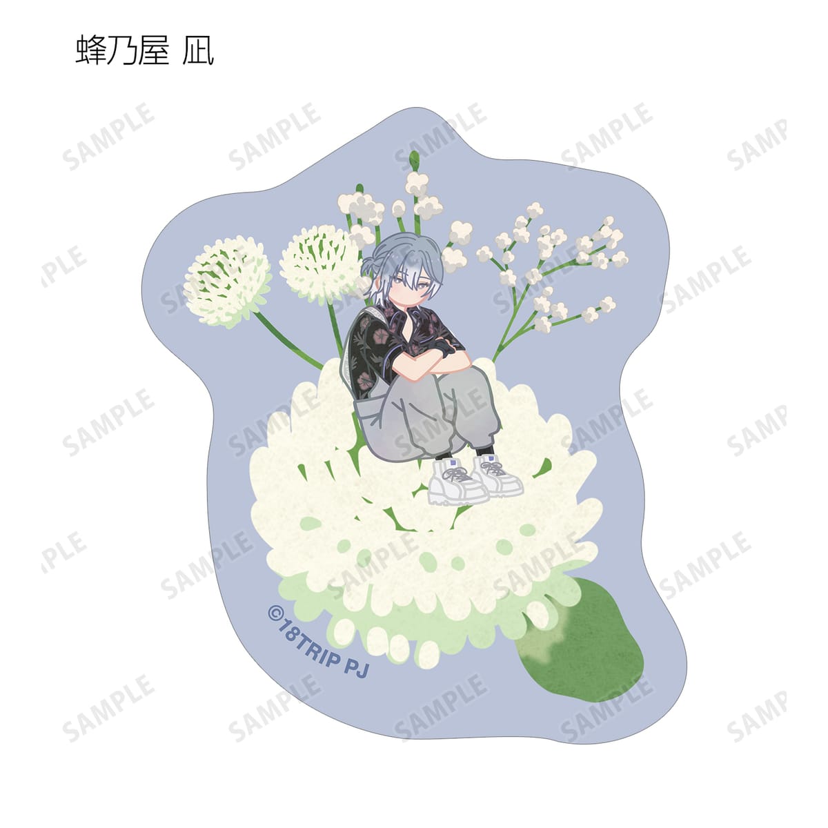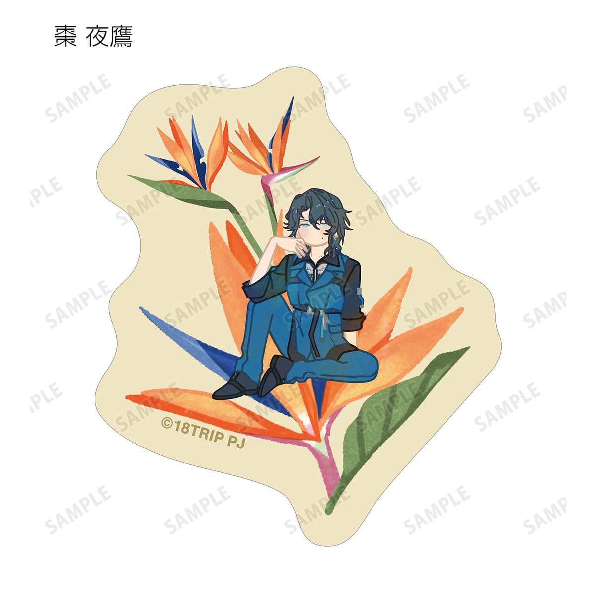 蜂乃屋 凪、白光 糖衣、白光 琉衣、棗 夜鷹、夜半 子タろのイラストをボタニカルデザインに落とし込んで繊細なタッチで新たに描き起こし、フレークシールに仕上げました。