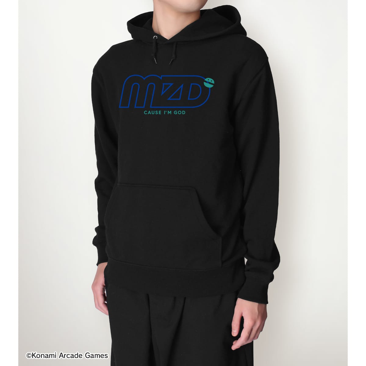 MZD、ポップくんの描き起こし、WIN時のセリフ「神だから?」の英語訳「BECAUSE I'M GOD」を、プルオーバーフーディーに仕上げました。