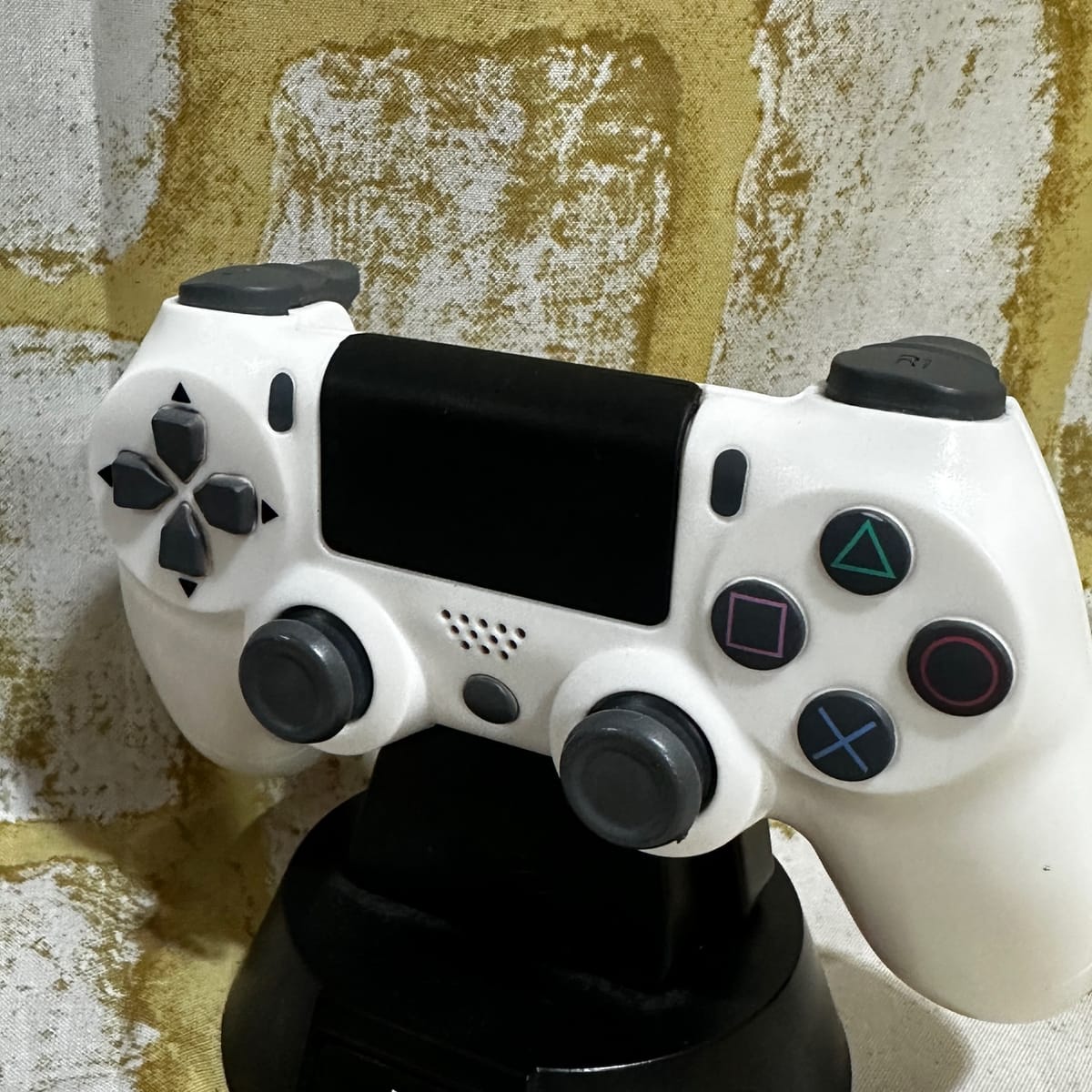 ■シンボリックな三角形、円、四角、Xの記号を再現し、スタンドのPSロゴボタンを押すとコントローラーのボディが白く点灯します