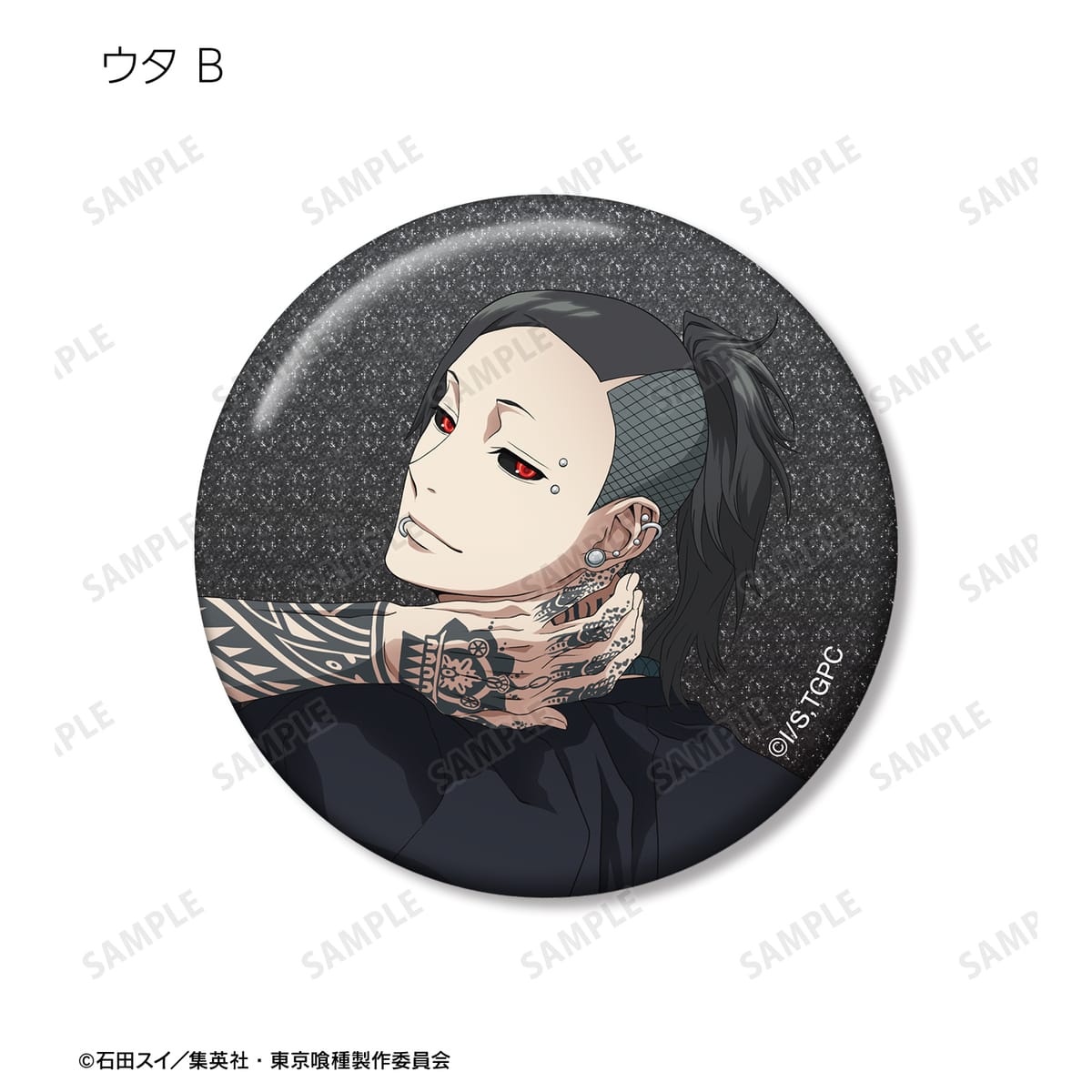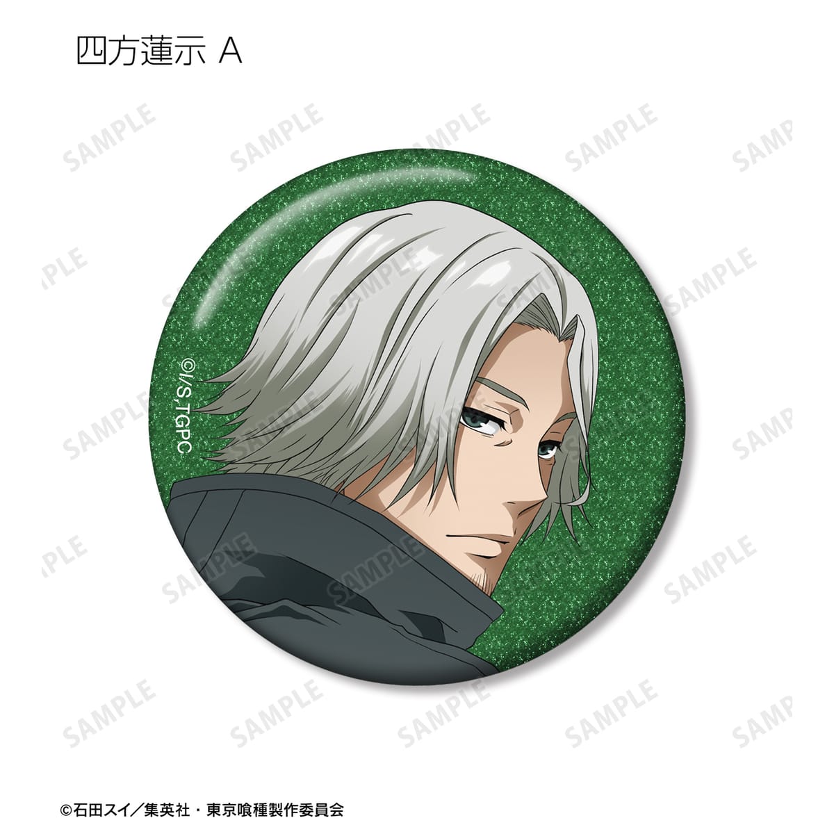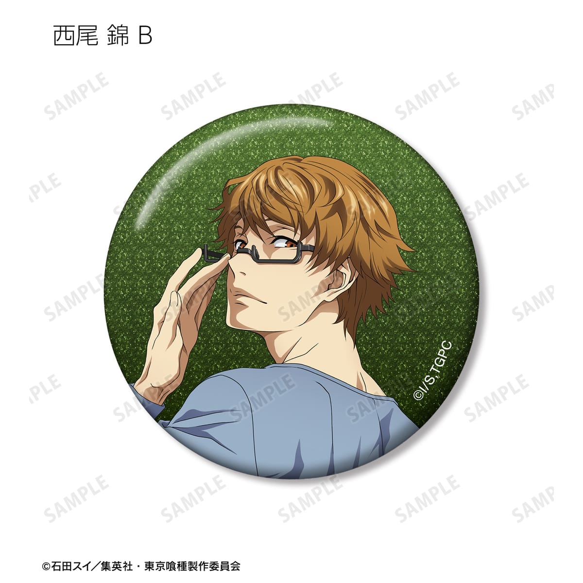 金木 研、西尾 錦、四方蓮示、月山 習、ウタ、鈴屋什造の描き下ろしイラストをグリッター加工を施した缶バッジに仕上げました。