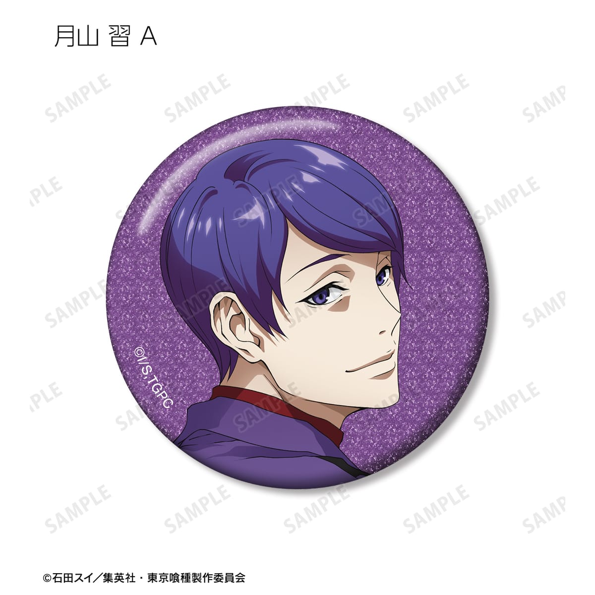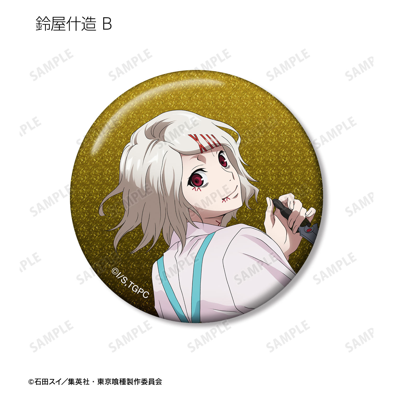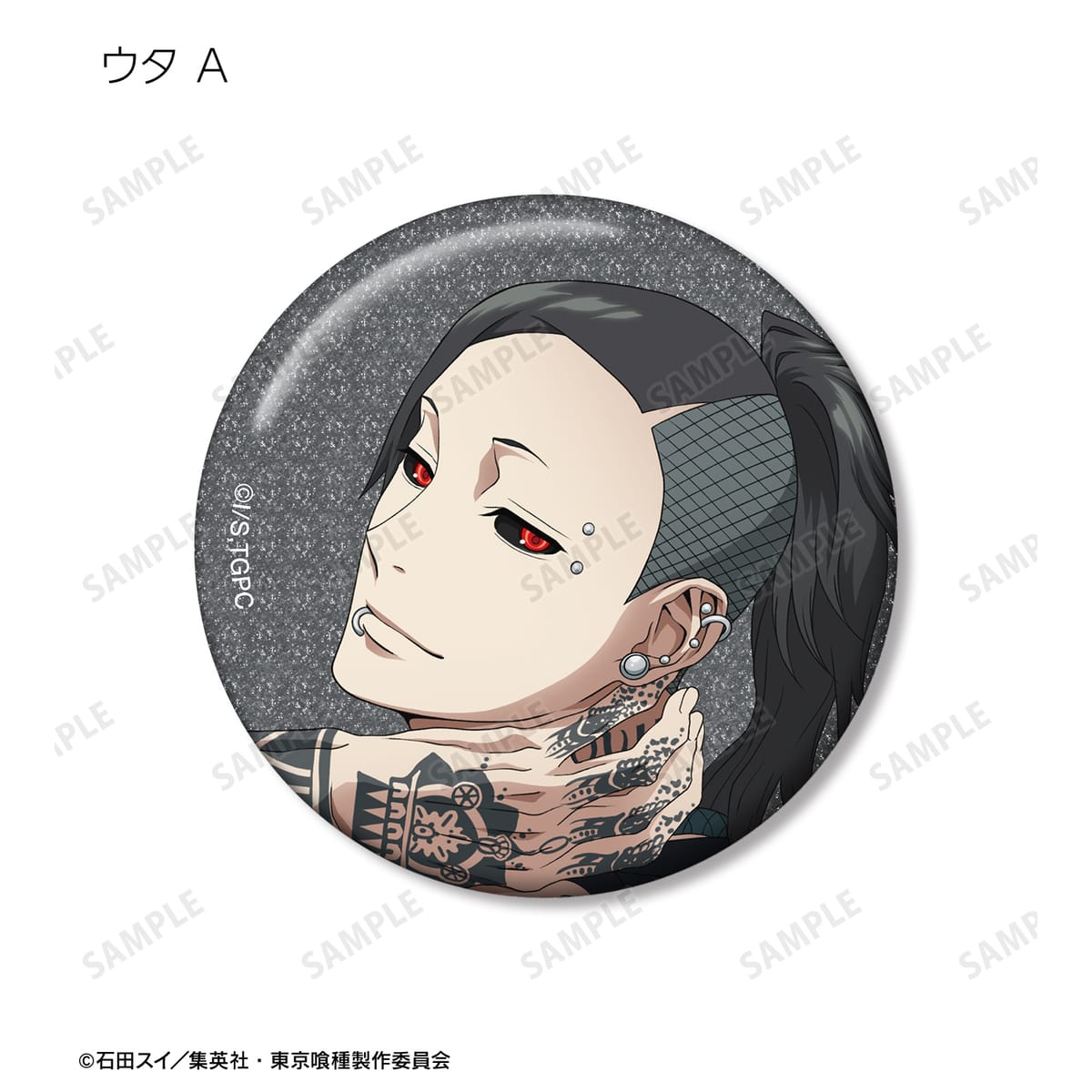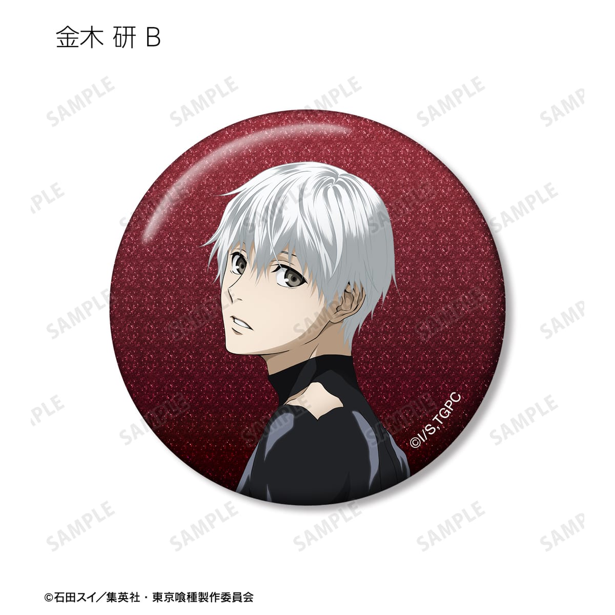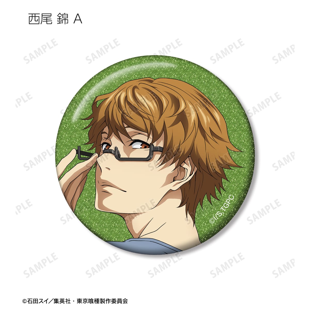 金木 研、西尾 錦、四方蓮示、月山 習、ウタ、鈴屋什造の描き下ろしイラストをグリッター加工を施した缶バッジに仕上げました。