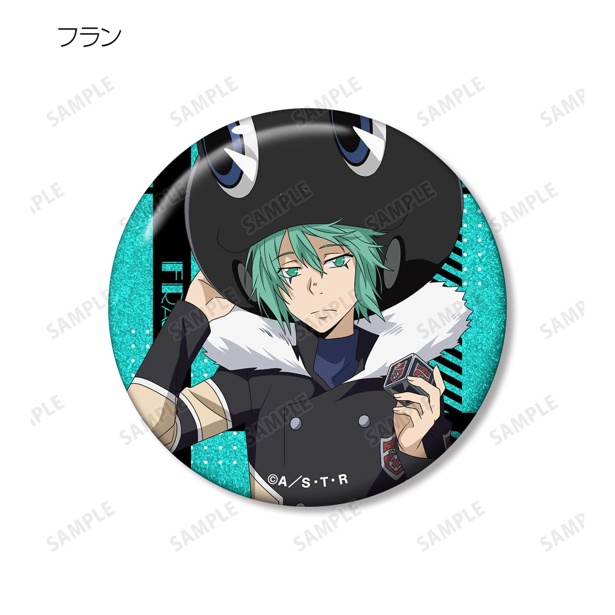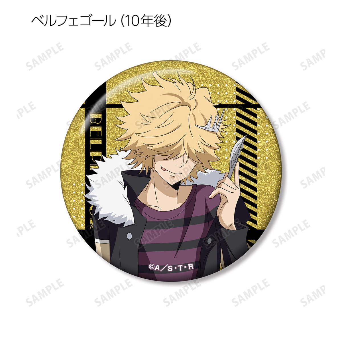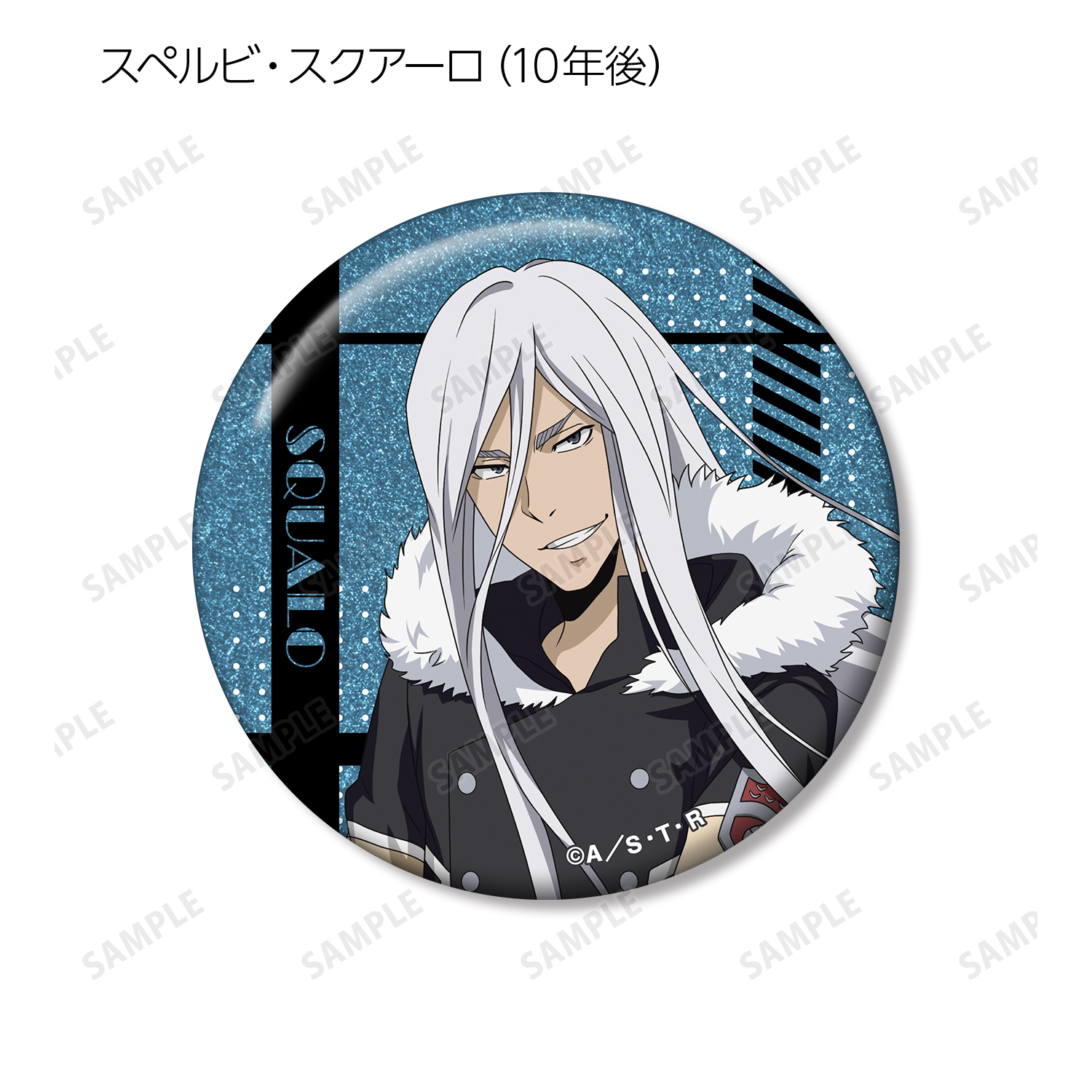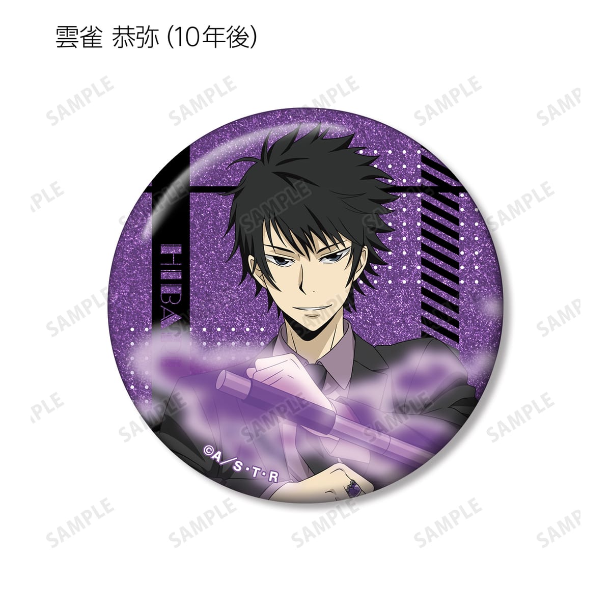 沢田 綱吉、リボーン、獄寺 隼人(10年後)、山本 武(10年後)、雲雀 恭弥(10年後)、六道 骸(10年後)、ディーノ(10年後)、XANXUS(10年後)、スペルビ・スクアーロ(10年後)、ベルフェゴール(10年後)、フラン、白蘭の描き下ろしイラストをグリッター加工を施した缶バッジに仕上げました。