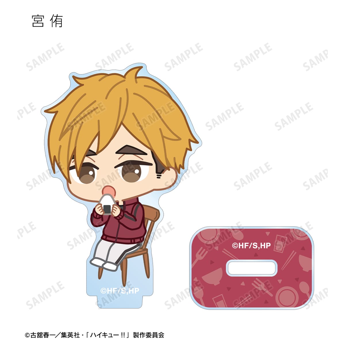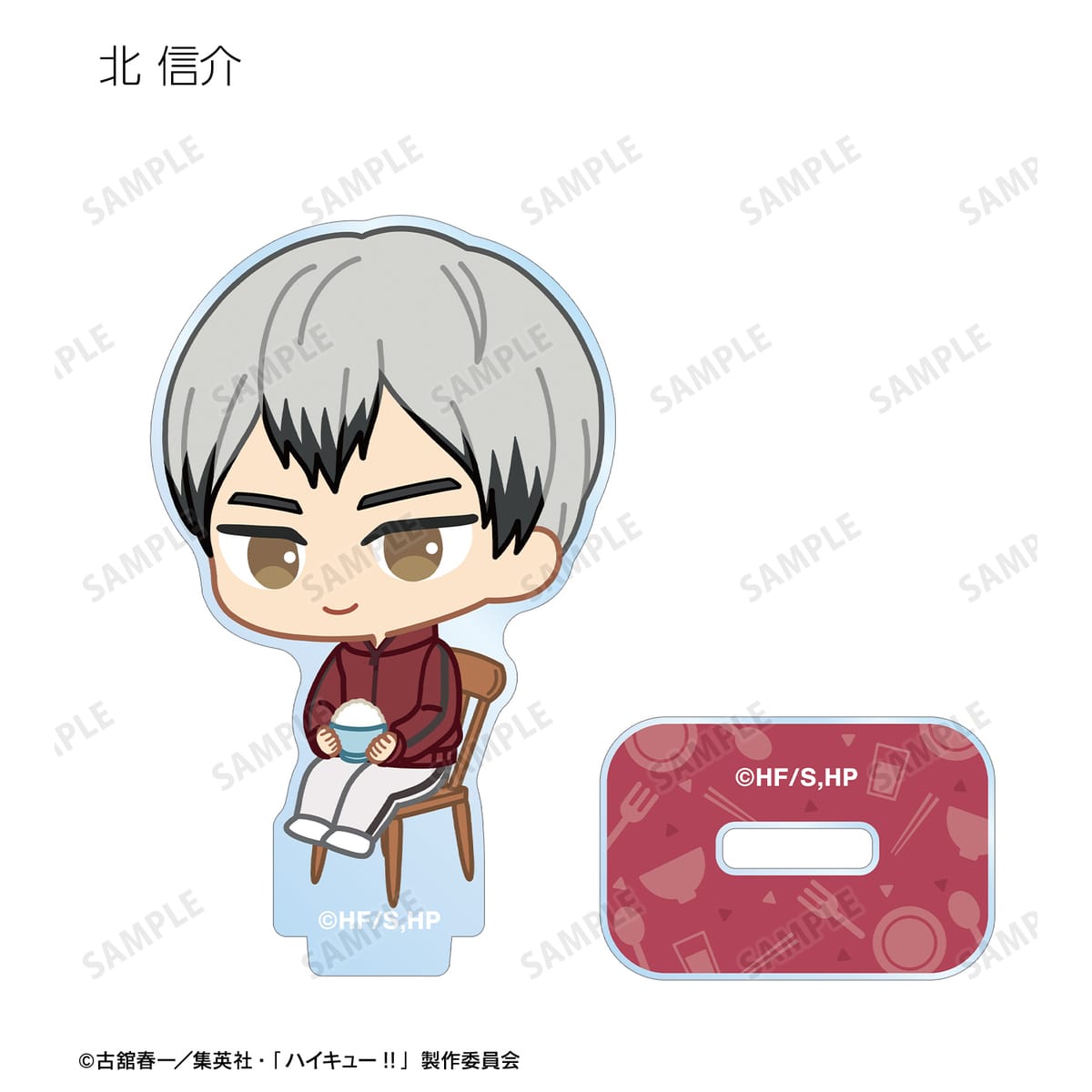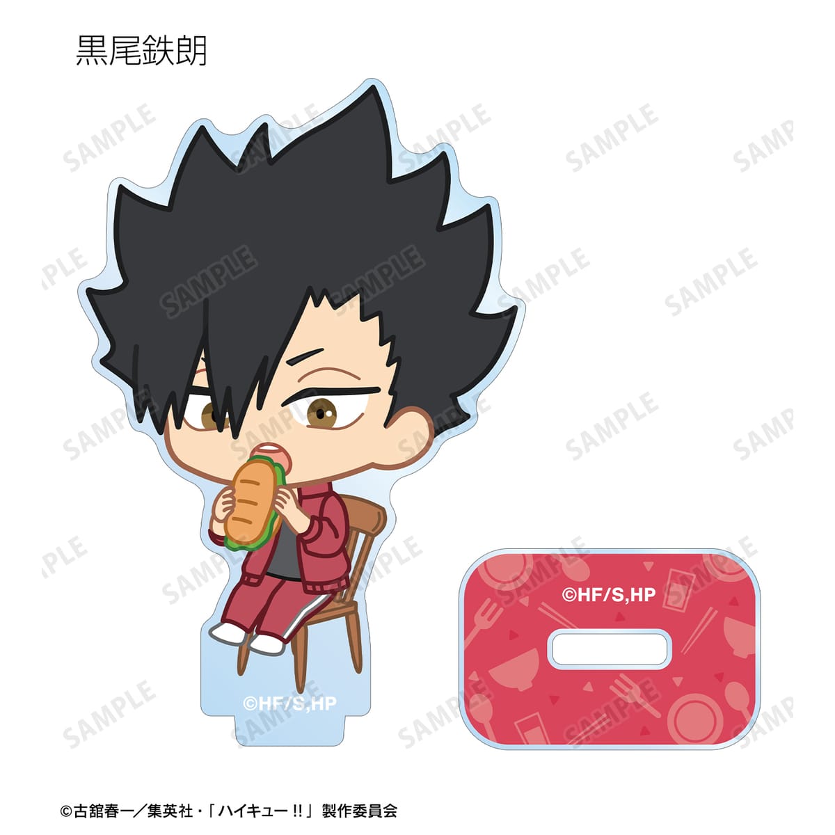 黒尾鉄朗、孤爪研磨、木兎光太郎、赤葦京治、宮 侑、宮 治、北 信介、角名倫太郎の描き起こしちびキャライラストをメインにデザインし、アクリルスタンドに仕上げました。