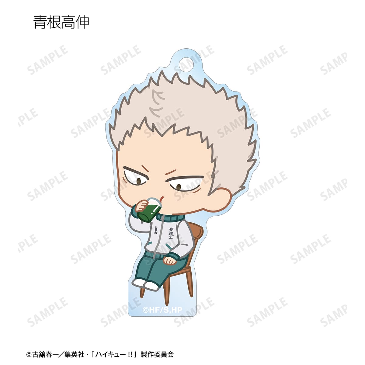 日向翔陽、影山飛雄、月島 蛍、山口 忠、及川 徹、岩泉 一、青根高伸、二口堅治、牛島若利、天童 覚の描き起こしちびキャライラストをメインにデザインし、アクリルキーホルダーに仕上げました。
