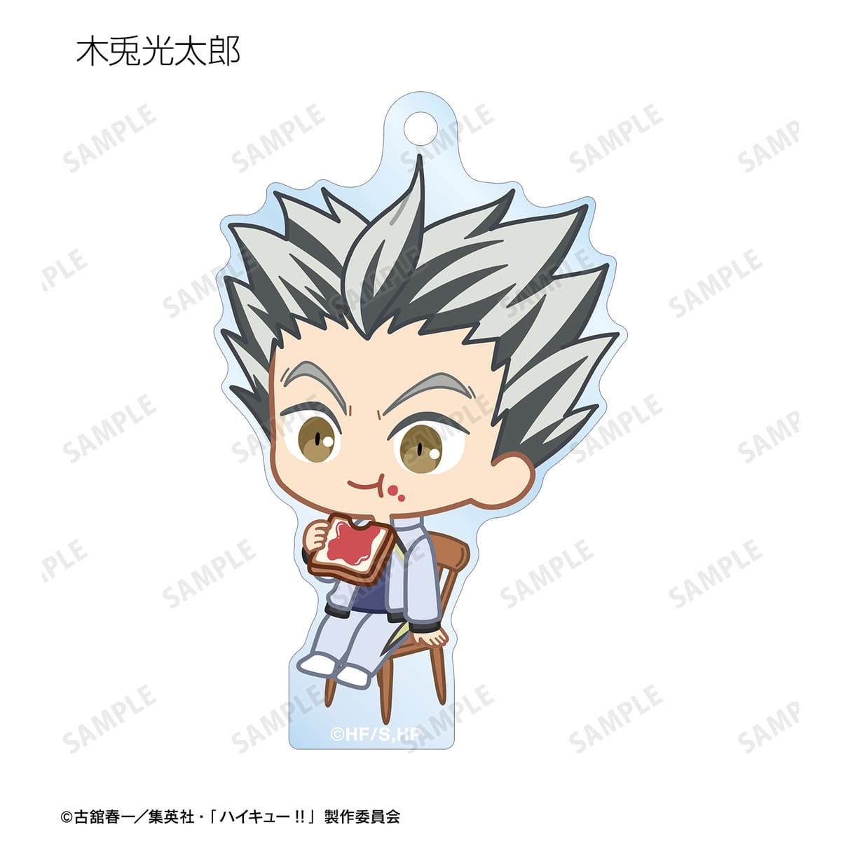 黒尾鉄朗、孤爪研磨、木兎光太郎、赤葦京治、宮 侑、宮 治、北 信介、角名倫太郎の描き起こしちびキャライラストをメインにデザインし、アクリルキーホルダーに仕上げました。