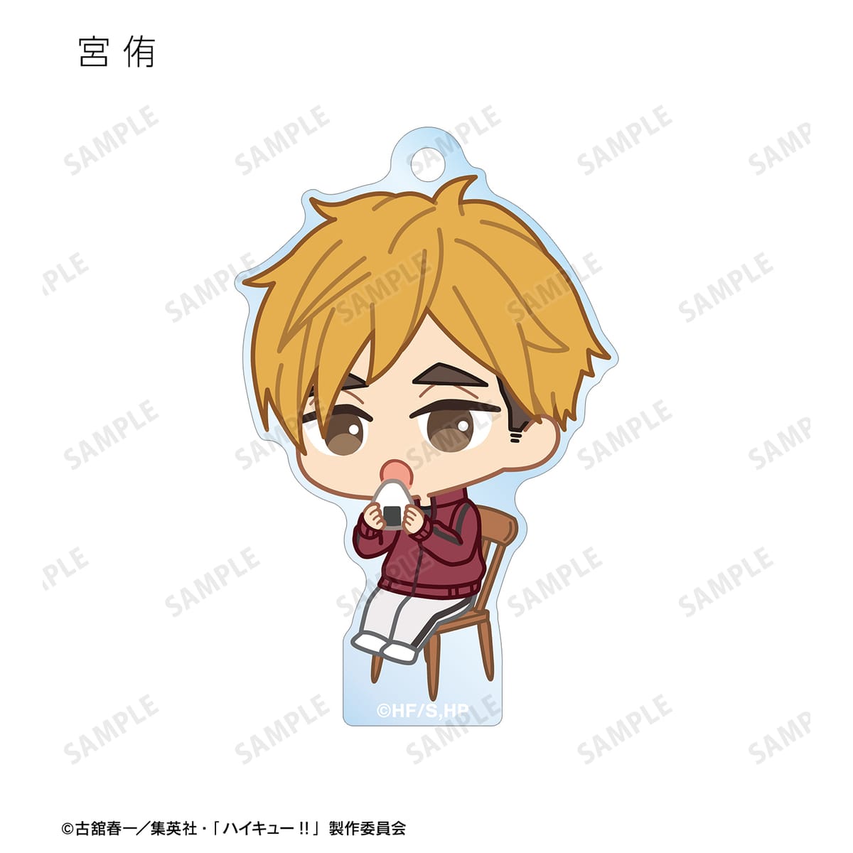 黒尾鉄朗、孤爪研磨、木兎光太郎、赤葦京治、宮 侑、宮 治、北 信介、角名倫太郎の描き起こしちびキャライラストをメインにデザインし、アクリルキーホルダーに仕上げました。