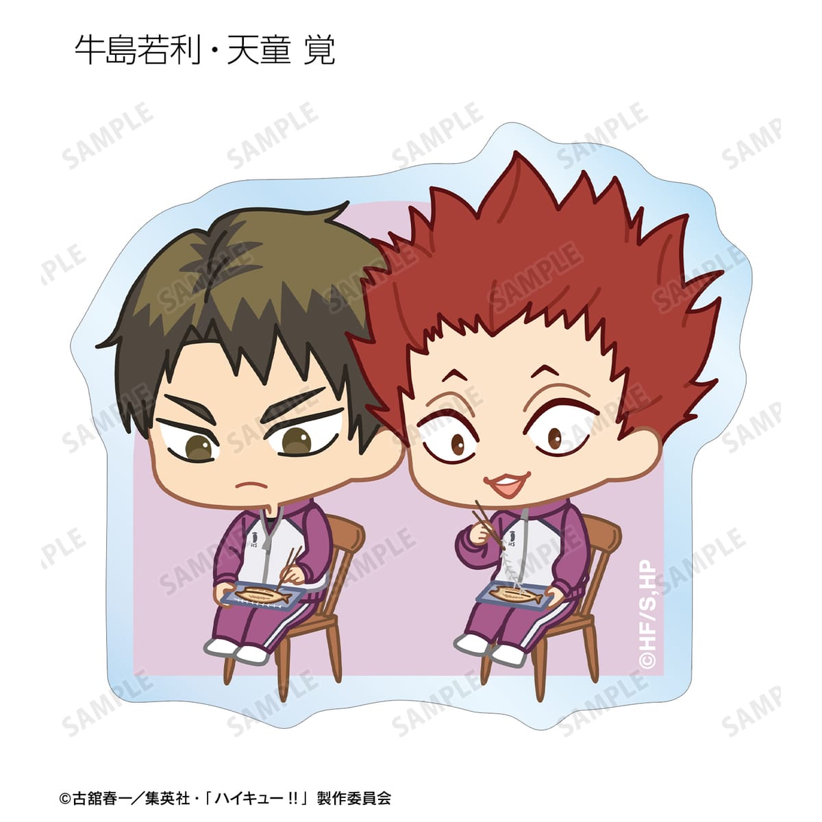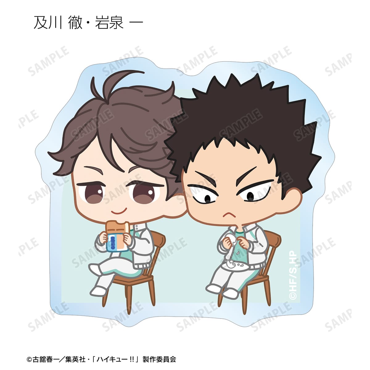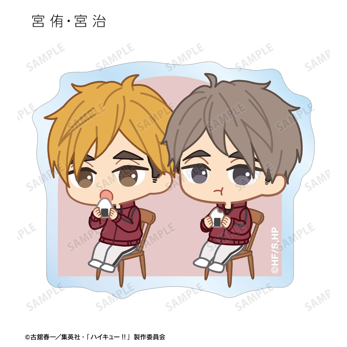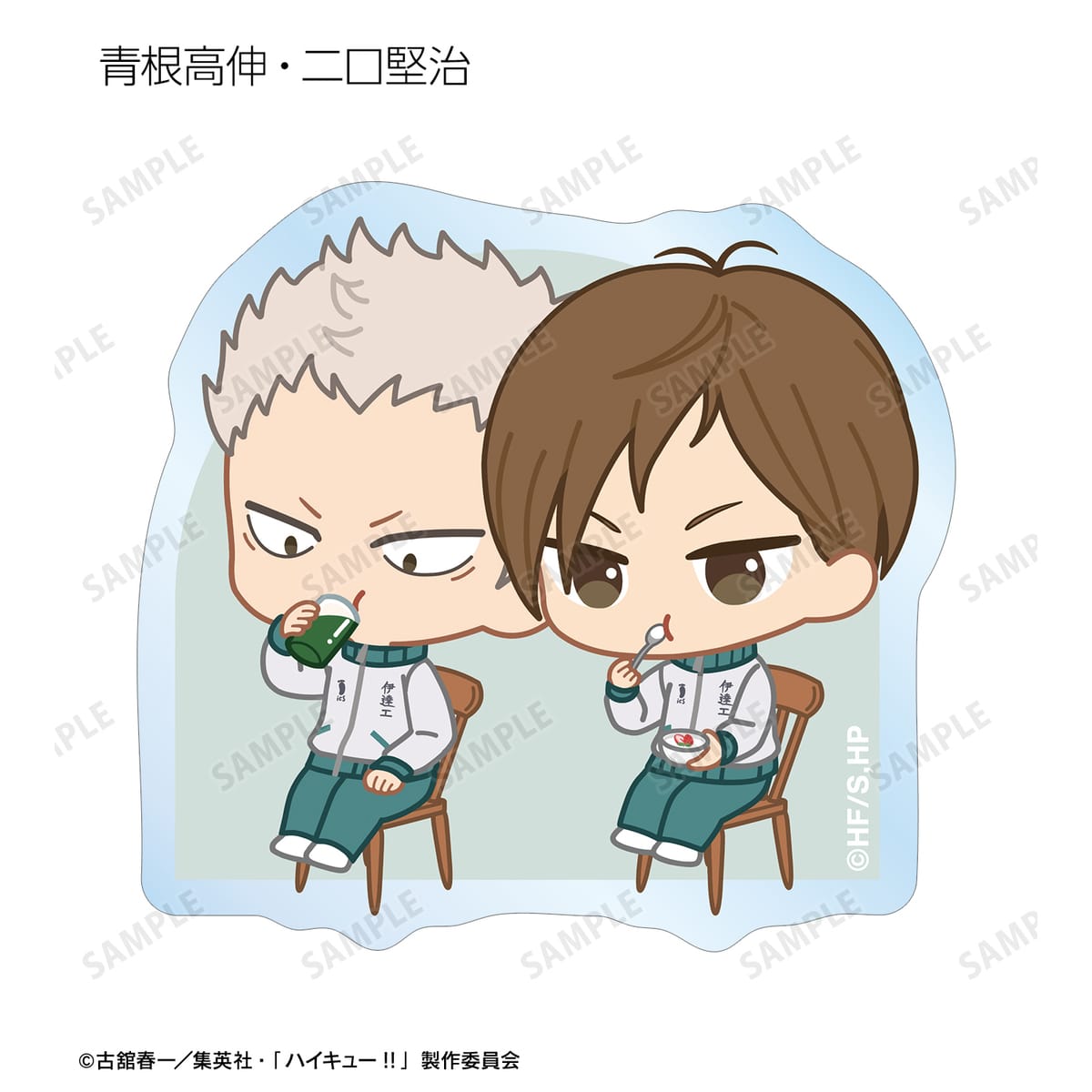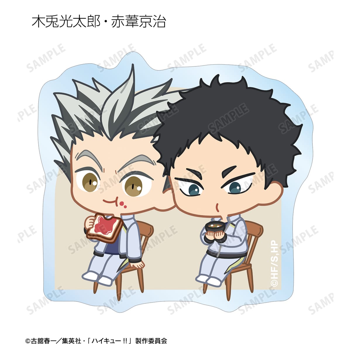 日向翔陽、影山飛雄、月島 蛍、山口 忠、及川 徹、岩泉 一、黒尾鉄朗、孤爪研磨、青根高伸、二口堅治、牛島若利、天童 覚、木兎光太郎、赤葦京治、宮 侑、宮 治、北 信介、角名倫太郎の描き起こしちびキャライラストをメインにデザインし、ダイカットのステッカーに仕上げました。