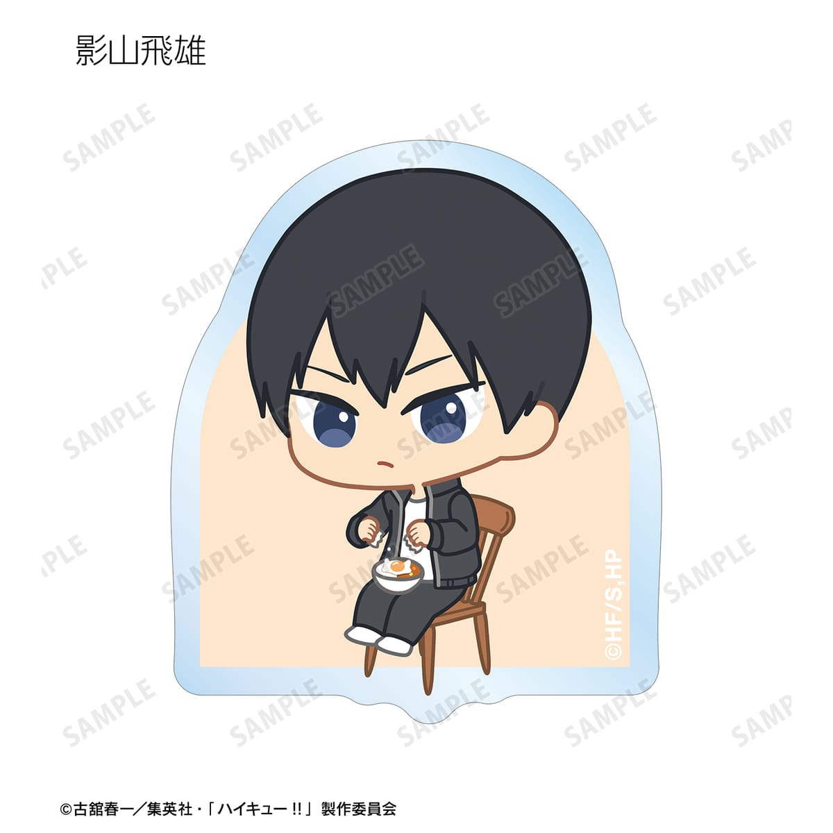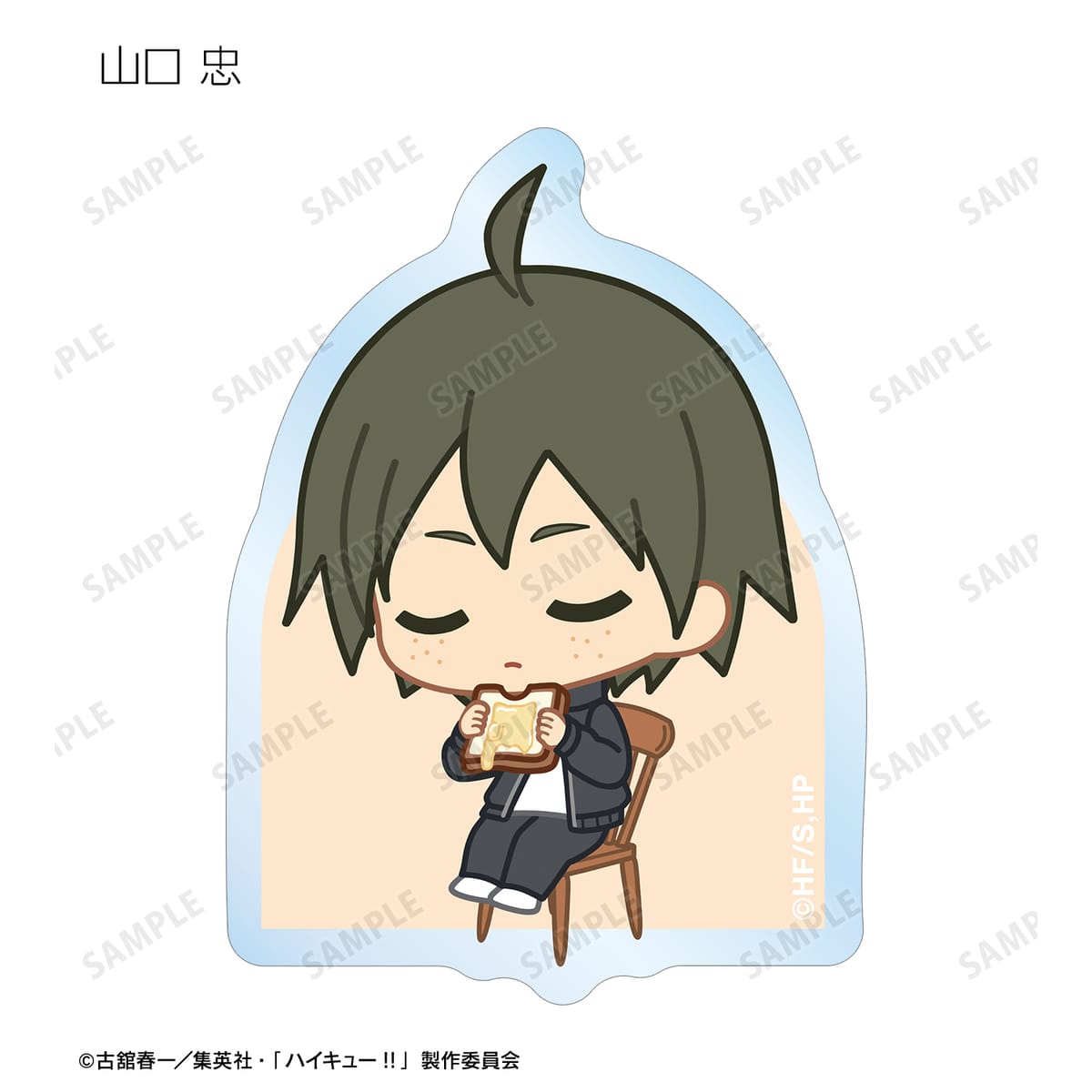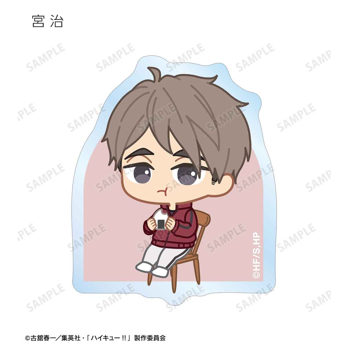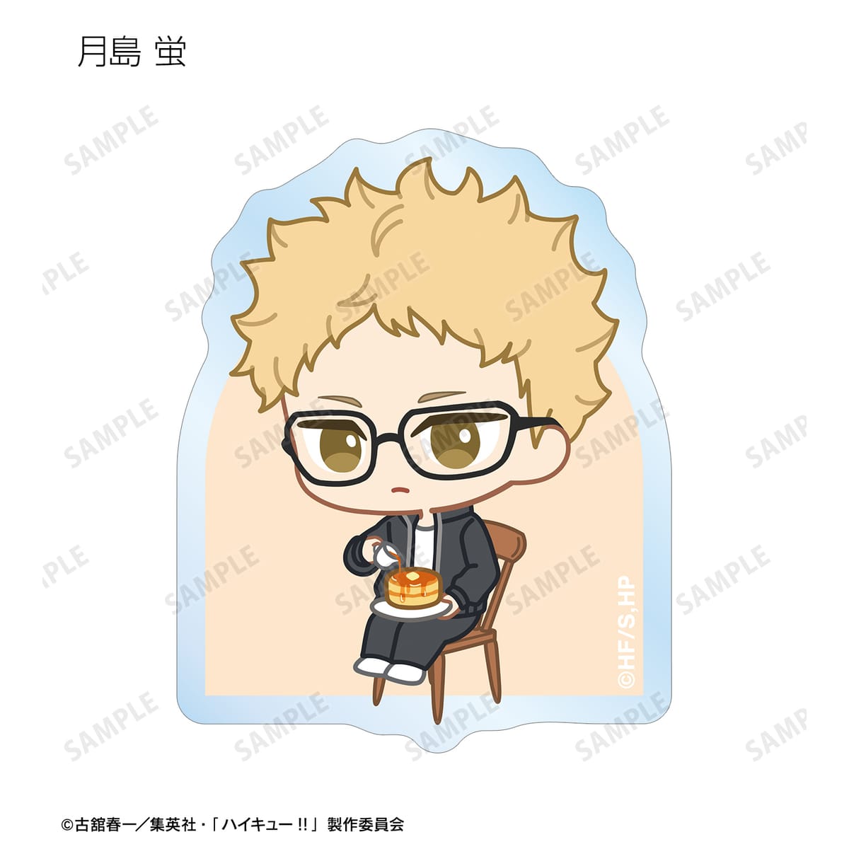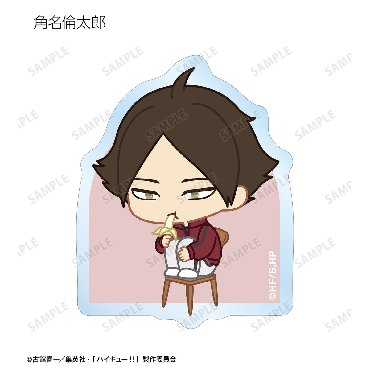 日向翔陽、影山飛雄、月島 蛍、山口 忠、及川 徹、岩泉 一、黒尾鉄朗、孤爪研磨、青根高伸、二口堅治、牛島若利、天童 覚、木兎光太郎、赤葦京治、宮 侑、宮 治、北 信介、角名倫太郎の描き起こしちびキャライラストをメインにデザインし、ダイカットのステッカーに仕上げました。