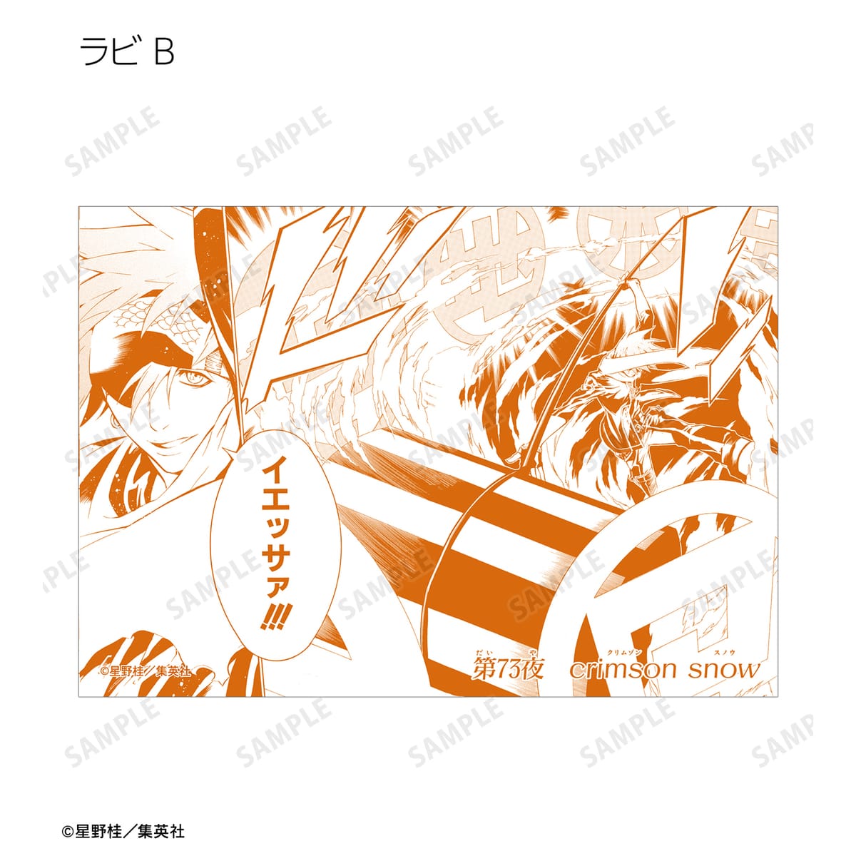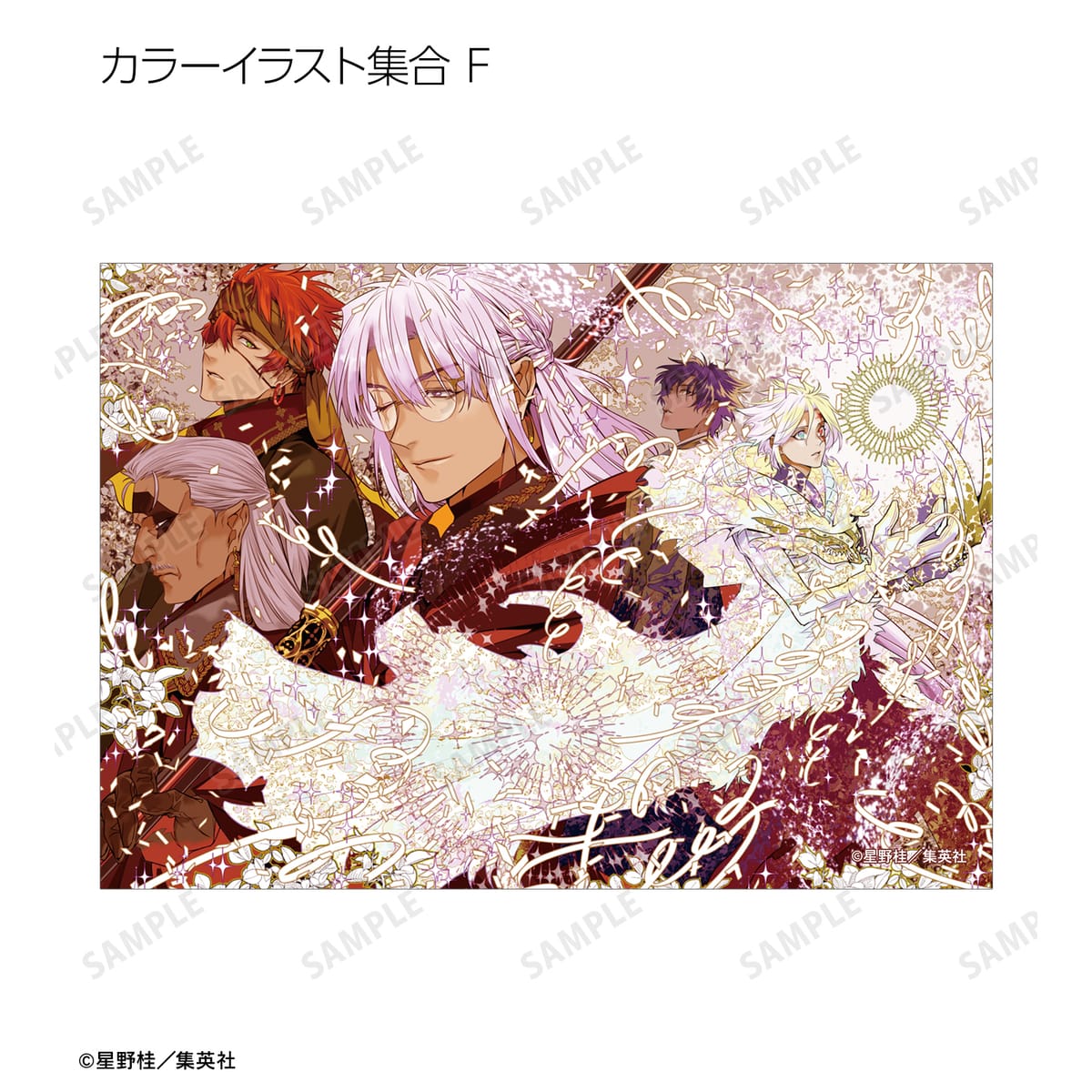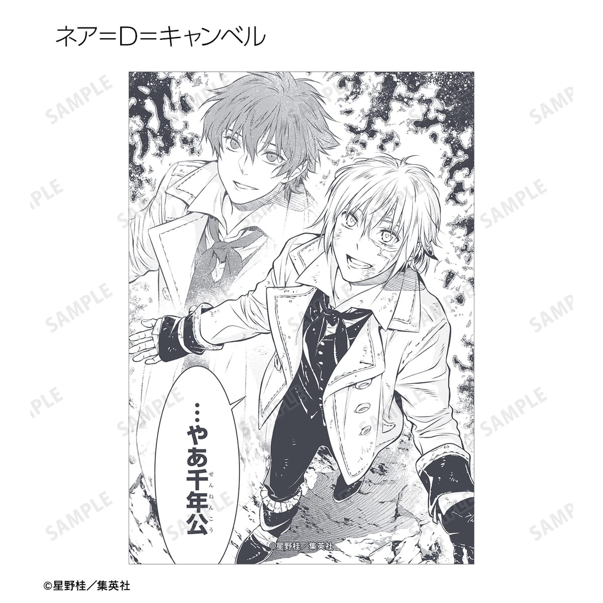 アレン・ウォーカー、クロス・マリアン、神田ユウ、ラビ、リナリー・リー、アレイスター・クロウリー三世、ミランダ・ロットー、ティモシー・ハースト、憑神、ティムキャンピー、ハワード・リンク、ロード・キャメロット、ティキ・ミック、ジャスデロ、デビット、ネア=D=キャンベル、ブックマン、先代ブックマンJr.の原作コマ、カラーイラストをブロマイドに仕上げました。