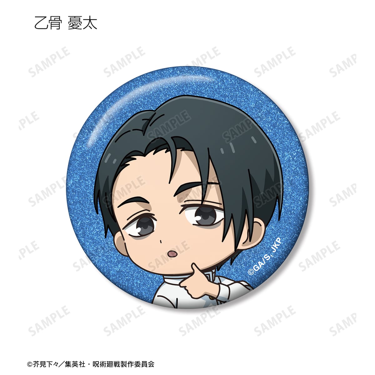 虎杖 悠仁、伏黒 恵、乙骨 憂太、脹相、禪院 直哉、夏油 傑、宿儺の描き起こしちびキャライラストをメインにデザインし、グリッター加工を施した缶バッジに仕上げました。