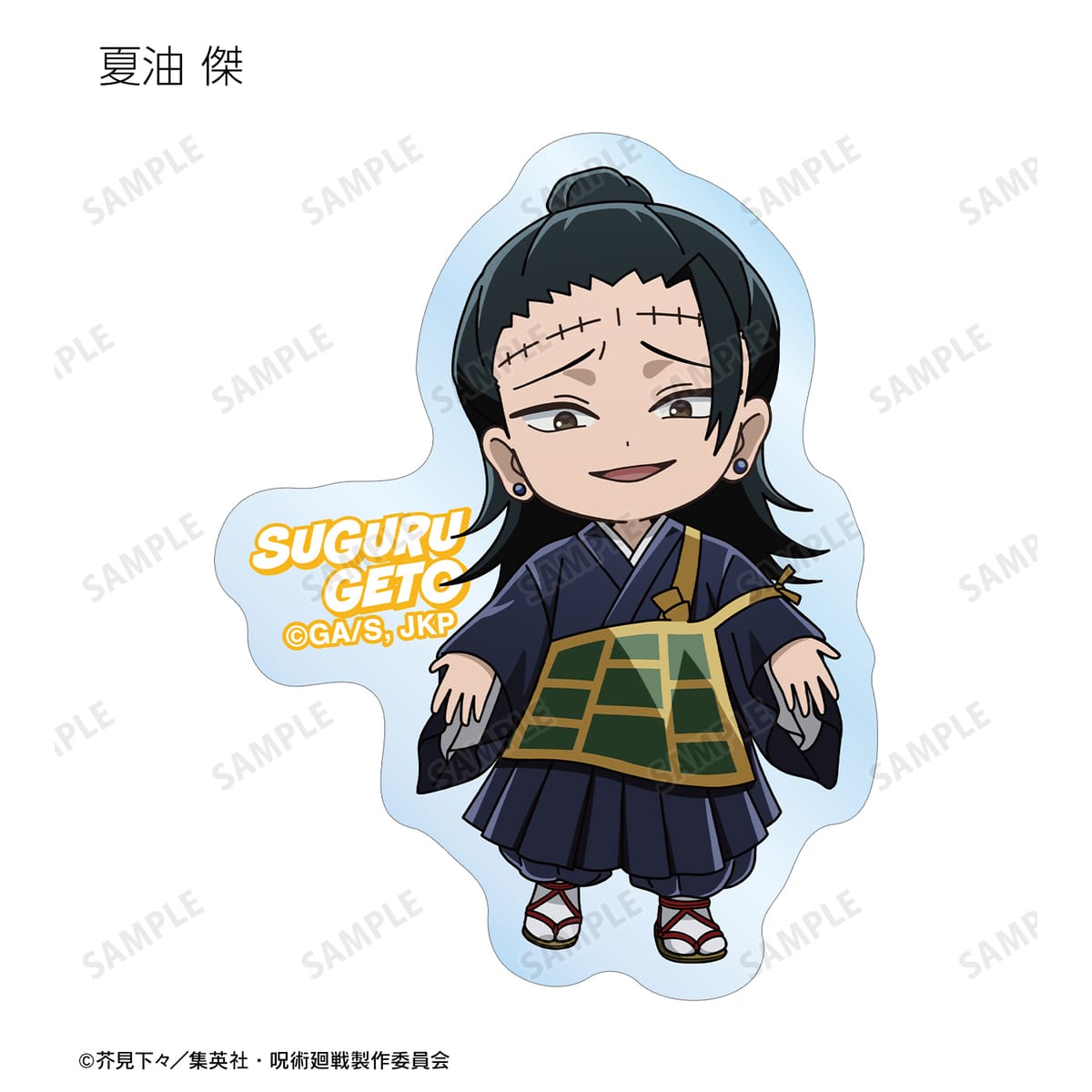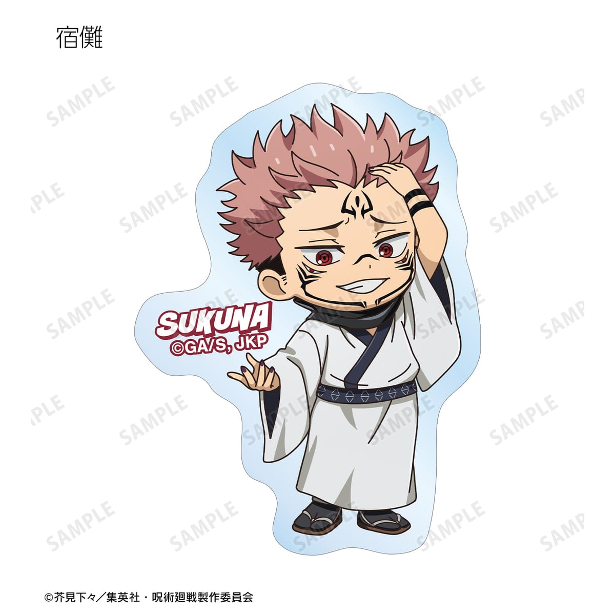 虎杖 悠仁、伏黒 恵、乙骨 憂太、脹相、禪院 直哉、夏油 傑、宿儺の描き起こしちびキャライラストをメインにデザインし、ダイカットのステッカーに仕上げました。
