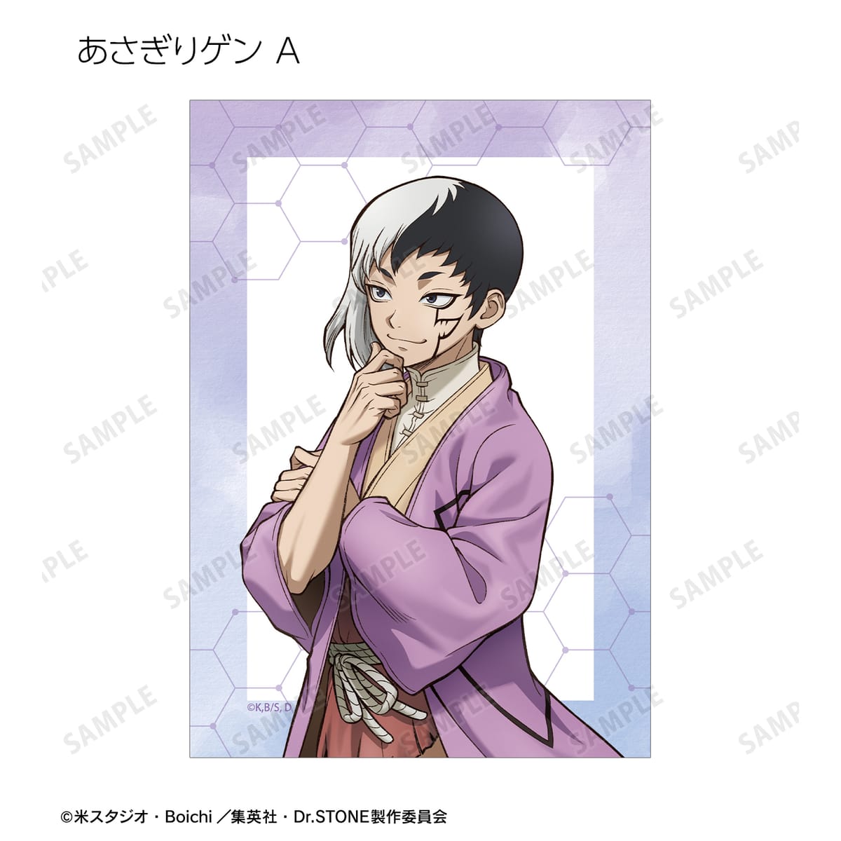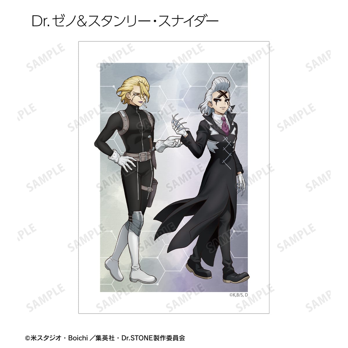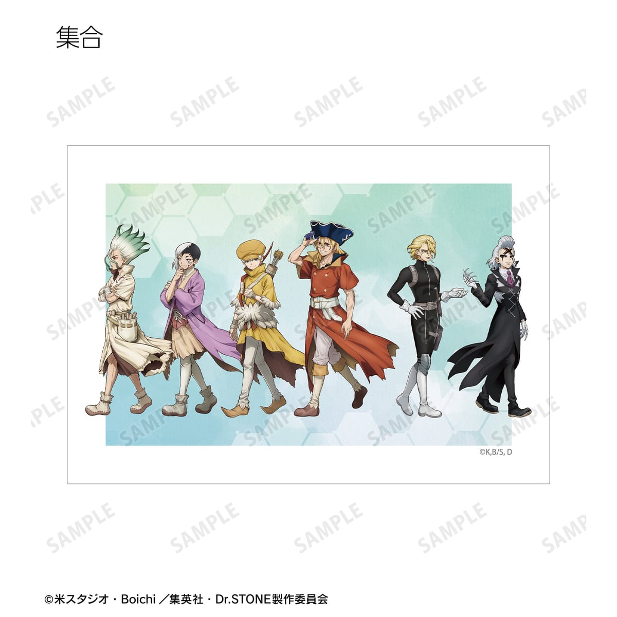 石神千空、あさぎりゲン、七海龍水、西園寺羽京、Dr.ゼノ、スタンリー・スナイダーの描き下ろしイラストをブロマイドに仕上げました。