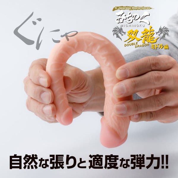 みちのくシリーズより、ダブルで使える双頭ディルドが登場!一人でも二人でも楽しめる、魅惑の快感『みちのく双龍』です。みちのく双龍はダブルヘッド型のディルドです。異なる太さを持つ両端デザインにより、初心者から上級者まで幅広く対応します。細い側はスムーズな挿入をサポートし、太い側ではしっかりとした圧迫感と充実した刺激を体感。好みや気分によって使用する先端を変えるのも良し、パートナーと共有してプレイするも良しと遊び方は自由自在です。ミドル編はリアルサイズの心地良さと、細身の手軽さを堪能することが可能です。また全長270mmと手軽に扱える軽妙さを実現したサイズ感です。単体使用はもちろん、カップルプレイにもおすすめです。みちのくシリーズ同様、やわらかくしなやかな素材で体の動きにフィット。1本で2つの快感を楽しめる万能デザインのディルドです。
