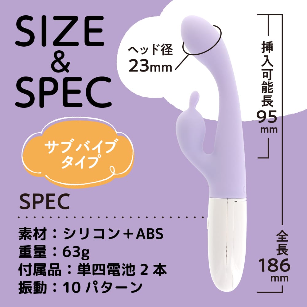 直径23mmのスマートヘッドだから簡単に入っちゃう。そのままGをピンポイント刺激出来ちゃうお手軽バイブ!肌触りが良く滑らかなシリコン素材だから挿れるのに抵抗のある方でも使って頂きやすいスマートでシルキーな入れ心地が特徴です。サブバイブ付きタイプはソトとナカの同時責めが出来ちゃうみんなが楽しいバイブスティックです。10パターンの心地良い振動と柔らかネックで何から何まで優しさに包まれてる普段使いしやすいアイテム。電源も単四電池2本だから手軽に楽しんで頂けます。