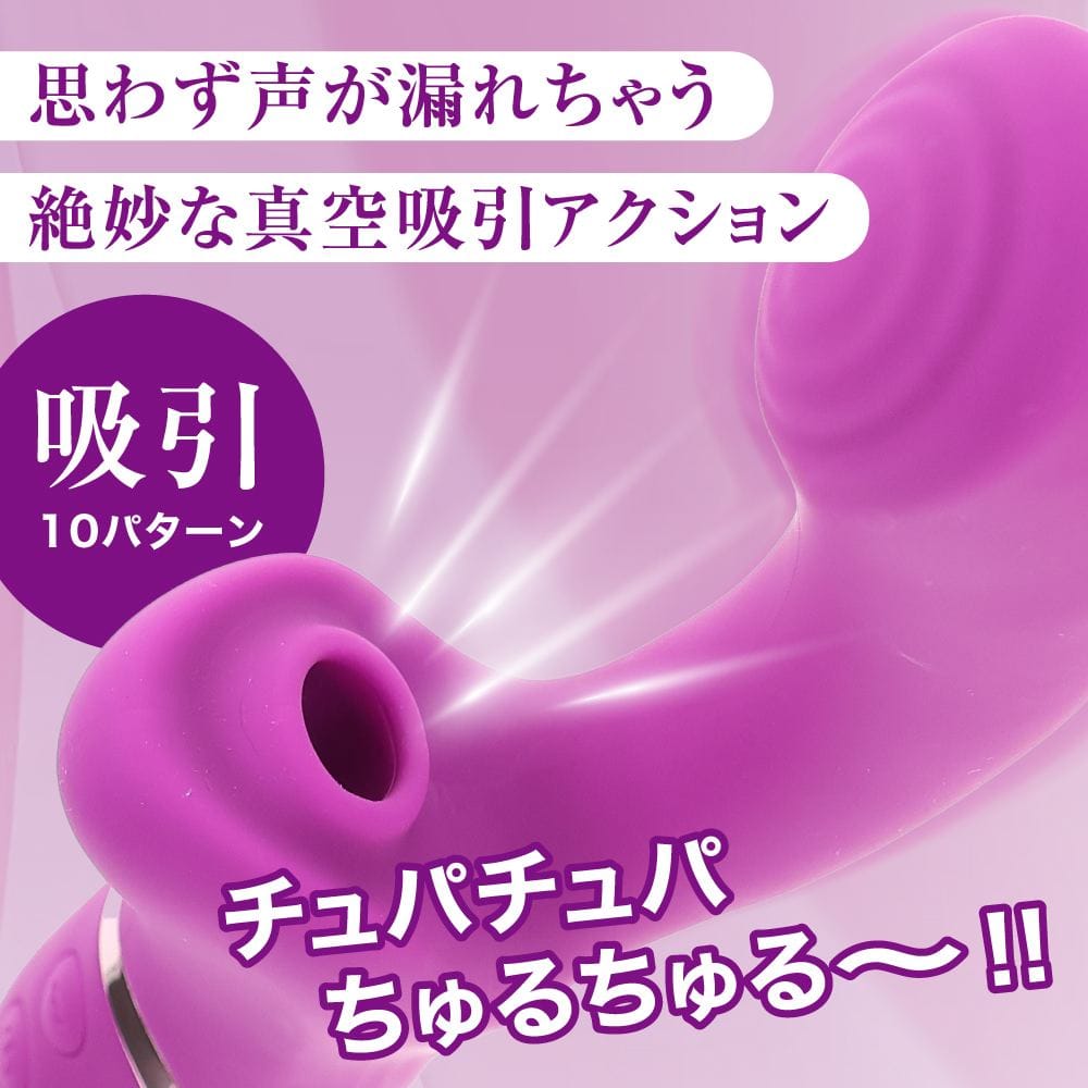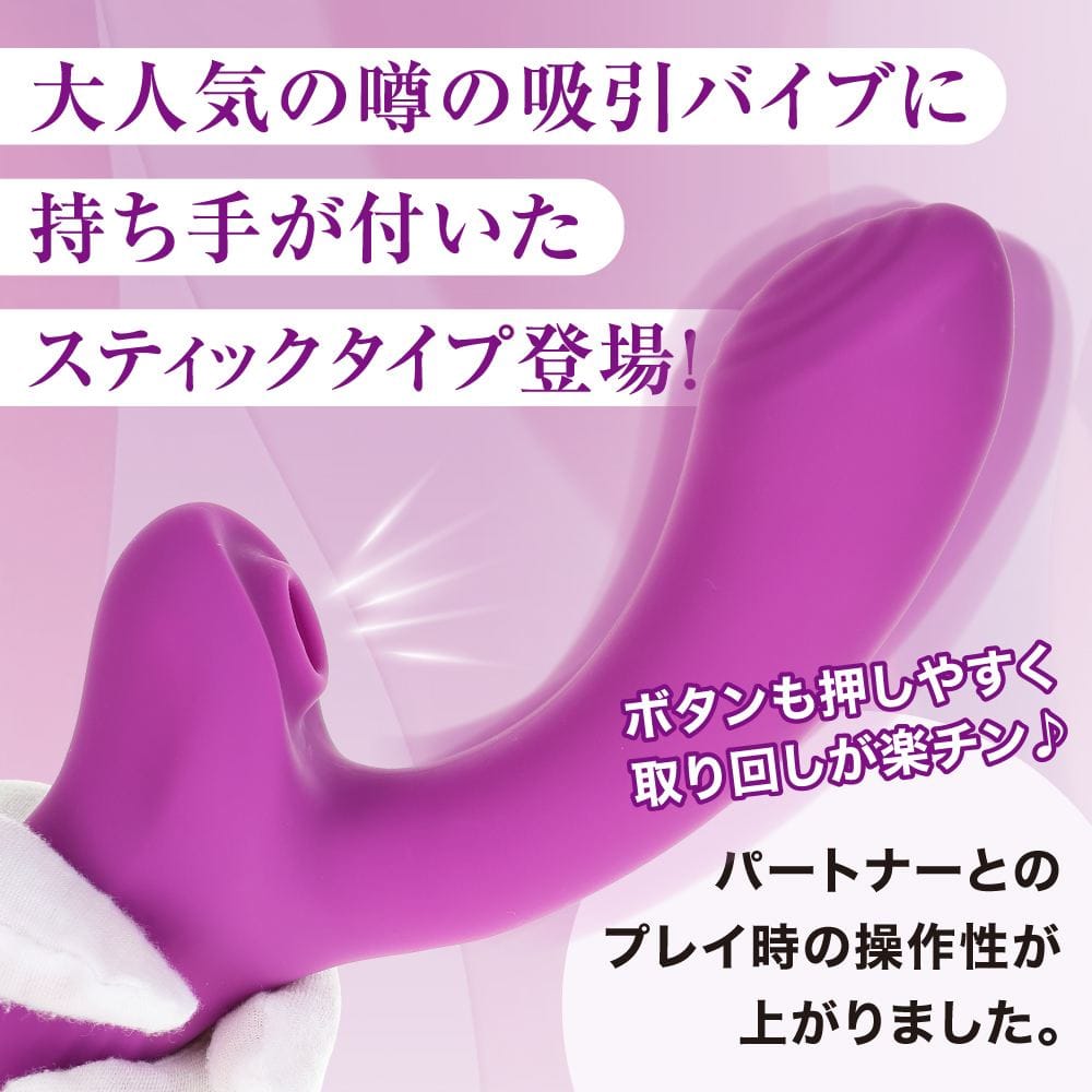中イキと外イキ、どっちもしっかり楽しめる!中責め振動快感とチュパチュパ吸引快感が同時に楽しめる噂の吸引バイブがアクション操作のしやすいスティックタイプになりました。滑らかで心地良い肌触りの高品質なオールシリコンボディに挿入しやすいのにしっかりと満たされる絶妙なデザインとサイズ感をプロダクト!振動用と吸引用に高性能なモーターを2機搭載!共に10種類の実用性の高いパターンをプログラムしています。リチウムイオンバッテリー充電式で120分の充電で最大45分の連続使用が可能(使用環境により大幅に増減します)使いやすくて気持ち良いバイブです。