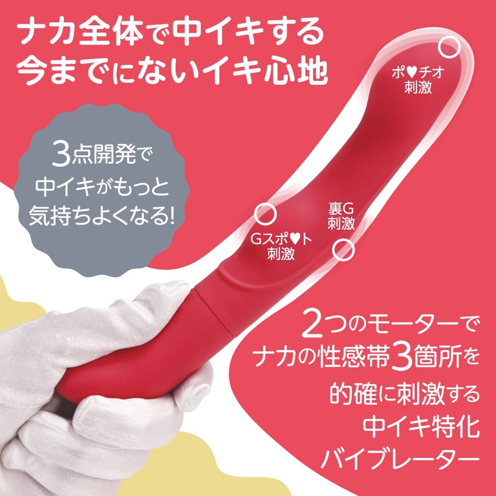 女性の中イキ性感帯のポル○オ・G・裏Gの3点に振動刺激をフォーカスした中イキ特化バイブです。先端とG・裏G部分を2つの高性能モーターでしっかり刺激しながら絶頂に導きます。振動パターンは強弱を細かく5段階調整+実用性の高い5パターン振動×2モーター。滑らかで肌触りの良い高品質シリコン素材を使用したオールシリコンボディ。性能とポイントやサイズ感を徹底調整したデザインの融合でジャストフィットする刺激を追い求めた商品です。中イキが好きな方も中イキ初心者の方にも開発用として最適な高性能バイブです。IPX6の高レベル防水性能だから、しっかり洗えて衛生的に長く楽しんで頂けます。120分充電で最大60分の連続使用が可能です。(使用環境により大幅に増減します。)