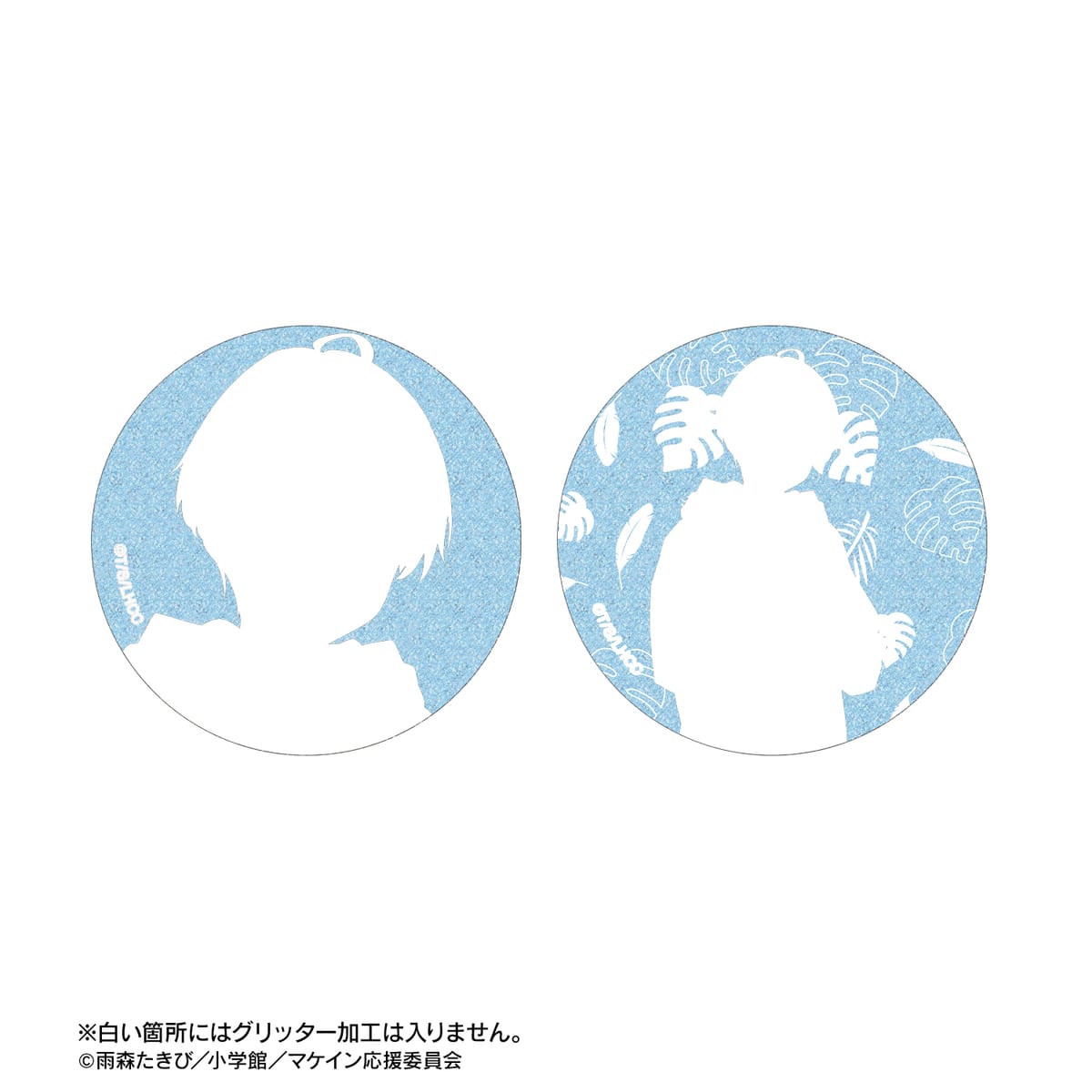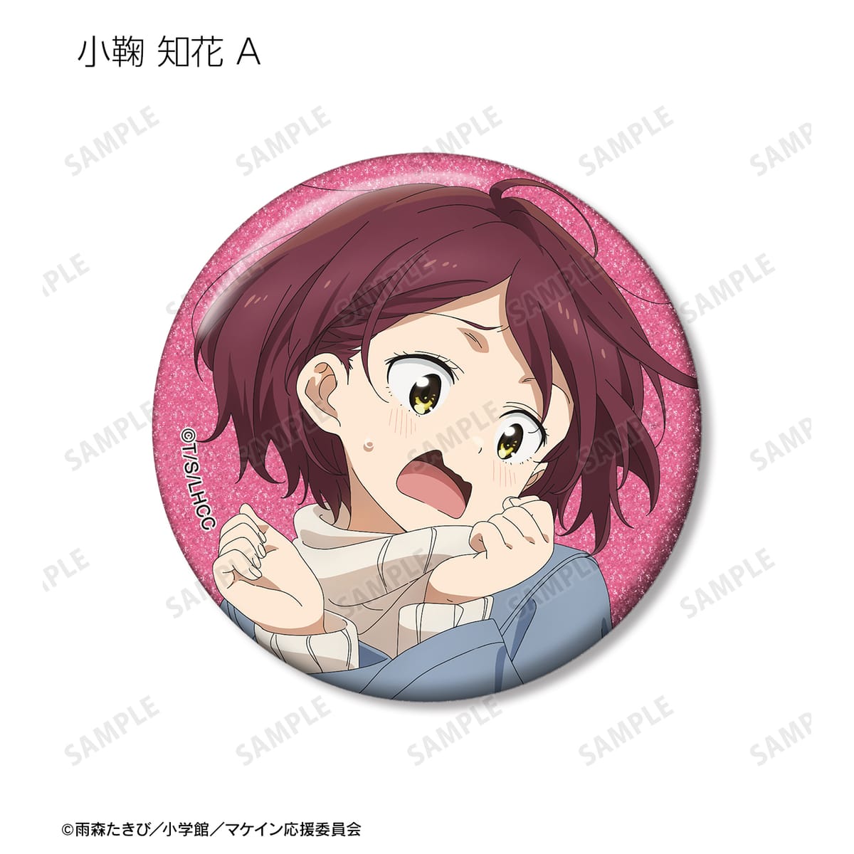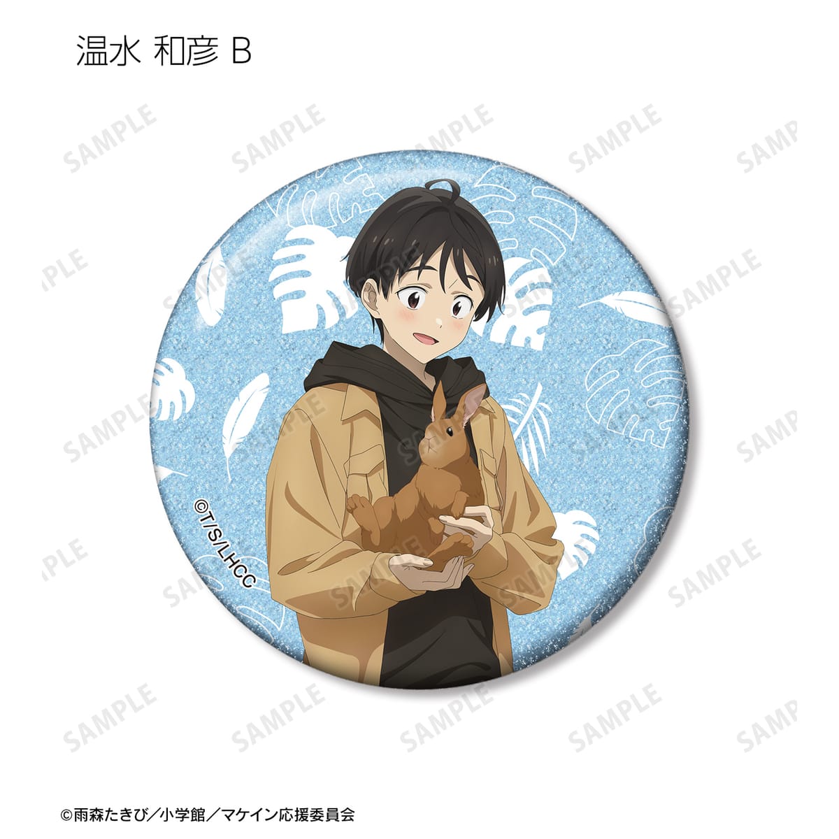 温水 和彦、八奈見 杏菜、焼塩 檸檬、小鞠 知花、温水 佳樹の描き下ろしイラストをグリッター加工を施した缶バッジに仕上げました。
